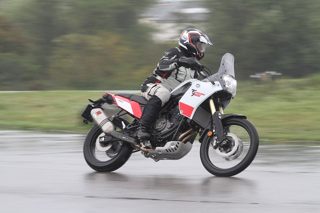 Niet alleen motorisch is de Ténéré 700 een allemansvriend: ook qua weggedrag is hij zo volgzaam als een golden retriever. Je kunt een heel gemakkelijk manoeuvreren en eventueel staand op de voetsteunen door smalle weggetjes of gravelpaadjes sturen. Als je heel scherpe u-bochten wilt maken, is het wat lastig dat hij zo hoog is, omdat je dan toch graag een voet aan de grond wilt zetten. Je merkt daarbij ook dat hij een beetje een grote naloop van 105 mm en “luie” balhoofdhoek van 27° heeft. Dat is gedaan om te zorgen dat hij offroad over een goede rechtuitstabiliteit beschikt en om te zorgen dat hij op de snelweg stabiel blijft. Dat is hij, tot 180 km/h toen gaat hij kaarsrecht rechtdoor en laat hij zich niet van de wijs brengen als je wat aan het stuur trekt of wat langsrichels tegenkomt. Dat is met motoren met lange veerwegen vaak wel anders. De Ténéré is stabiel en stuurt gewoon lekker, ook op hoge snelheden. Je kunt hem precies mikken waar je hem hebben wilt; in lange doorlopers blijft hij neutraal en in scherpe bochten kun je hem perfect op de apex kwakken, zonder dat hij de neiging heeft om wijd te lopen.