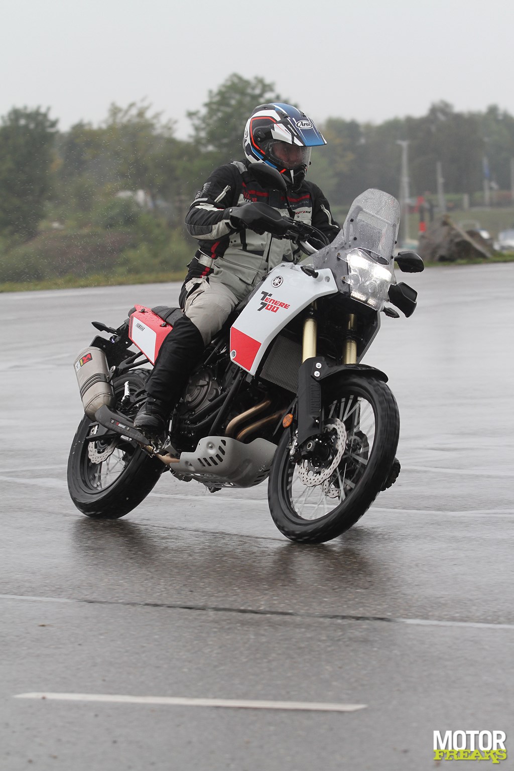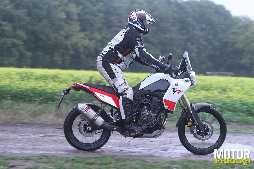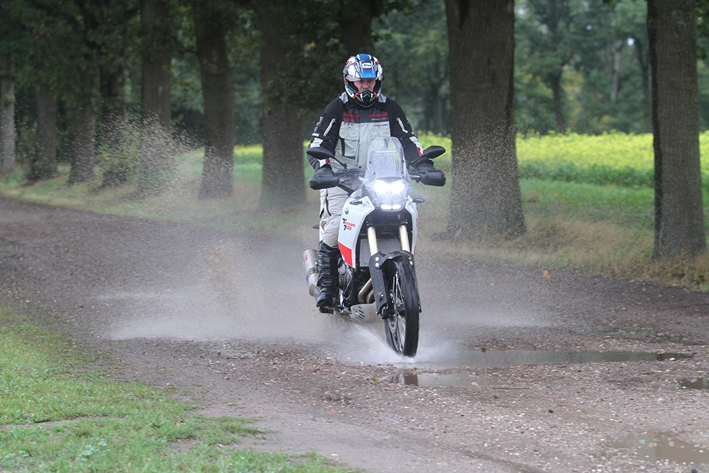 De Ténéré schept veel vertrouwen. Enerzijds door het gemakkelijke stuurgedrag, dat profiteert van het lage gewicht van slechts 187 kg. Het komt echter ook omdat de machine goed in balans is. De gewichtsverdeling is 48% voor, 52% achter en de vering is van grote klasse. De veerweg is er, maar de vering is stug en progressief genoeg om een goede feedback aan een goed absorptievermogen te koppelen. Op klinkerweggetjes voelt het wat stug, maar als je dan de Brabantse gravelpaden op stormt merk je ineens hoe strak de motor blijft. Hij vliegt over kuilen en bulten alsof ze er niet zijn en hij duikt niet eens heel hard als je flink in de ankers gaat. De dubbele, 282mm remmen – voorzien van Brembo zwevend gelagerde tweezuigerremtangen - zijn goed te doseren. In de regen vond ik ze wat tam, maar bij droog weer blijken ze soepel aan te grijpen en goed door te remmen wanneer je doorknijpt, zonder dat ze te fel zijn.