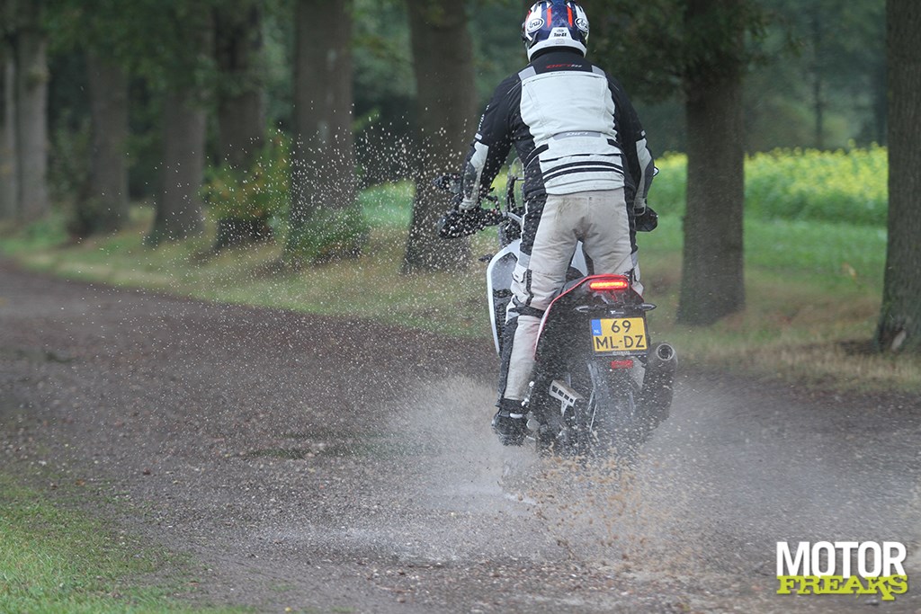 Ik had het kunnen weten, nog even onverhard. Uiteraard vol kuilen en gaten, zodat het water nu echt m'n laars inlooptOok als je remmend een bocht ingaat, merk je dat hij geen enkele neiging heeft om zich op te richten, hij valt ook niet verder de bocht in zodra je de rem loslaat. Het blijft heel vertrouwd aanvoelen, terwijl de Pirelli Scorpion Rally STR-banden toch een behoorlijk open profiel hebben. Ze hebben echter zat grip, zelfs in de regen, die ik in overvloed mocht meemaken deze week...!