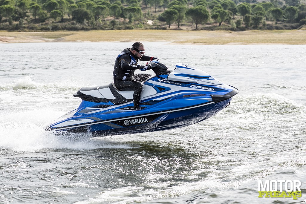 Maar die GP 1800, mán… opvallend is dat uitgerekend deze Waverunner minder spoorvast aanvoelt als de anderen. Als je ‘m echt lomp een hoek omgooit, lijkt er meer zijwaarts te glijden dan bij de anderen, terwijl je wel de supersterke waterjet van de dikke motor hebt. Maar wat zeiden ze bij de presentatie ook: het gedrag van de GP1800 is aanpasbaar: afhankelijk van waar je je gewicht plaatst is ‘ie juist stabieler of wendbaarder. Logisch ook, want dit is de machine waar Yamaha komend seizoen aan races mee gaat doen (waar ze overigens al herhaaldelijk kampioen geworden zijn), dus zie het als de nieuwe R1 voor komend jaar… maar dan anders. Dan krijg je dus nóg meer hi tech en is een variabel vaargedrag natuurlijk appeltje eitje. Maar het is dus ook echt te merken. Het zadel is laag genoeg om met een klein beetje moeite de knie plat op de treeplank te drukken en dan wordt de overeenkomst pas echt spookachtig: veel vermogen, scherp sturen, zitten op een zadel, knietje aan de eh..vloer, veel dichter bij motorrijden op het water kom je niet. En man wat is dit gááf!!!