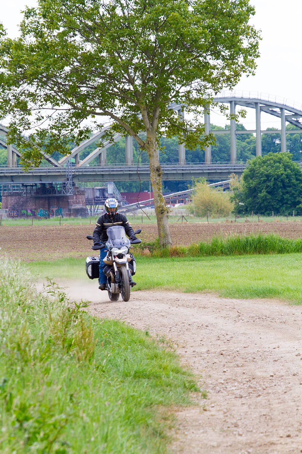 Tutto Terreno, zo heet hij, dus nam ik allengs de gelegenheid om een aardig zandpad op te zoeken. Precies dat pad waar ik eerder met de BMW G310 GS en de KTM 390 Adventure had gereden. Op dat behoorlijk kapotgereden pad blijft de Guzzi redelijk te controleren, zolang je niet te wild doet. Het is een reis-enduro, geen Dakar-machine. De vering heeft voor een allroads redelijk riante veerwegen van 170 mm voor en achter en kan de meeste hobbels en kuilen goed verwerken. Rijd je te hard, dan houdt hij het niet bij en wordt het een hobbelige rit. Als je moet keren op zo’n kuilenpad vraag je je ook wel af waar je aan begonnen bent, want dan is 229 kg nog best een boel. Op strakkere gravelpaden, zoals ik die bij Heumen weet, is deze Guzzi beter in zijn element. Daar kun je er best vlot overheen boenderen, waarbij je in de bochten zelfs vrij gecontroleerd een beetje kunt driften. Het ABS kun je daarbij dus aan de achterzijde uitzetten, terwijl hij voor met een aangepaste karakteristiek werkt als je de offroad-modus hebt gekozen. Op straat werkt het ABS zowel op het voor- als het achterwiel. Dat mag ook wel, want de vierzuigerremtangen van deze Guzzi zijn behoorlijk potent: ze grijpen goed aan en remmen stevig door zonder dat er al te veel handkracht voor nodig is. De achterrem is wat minder fel, hoewel hij een relatief grote remschijf van 260 mm heeft, moet je behoorlijk op het rempedaal duwen om een goede vertraging te halen.