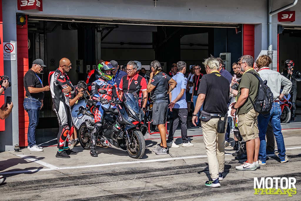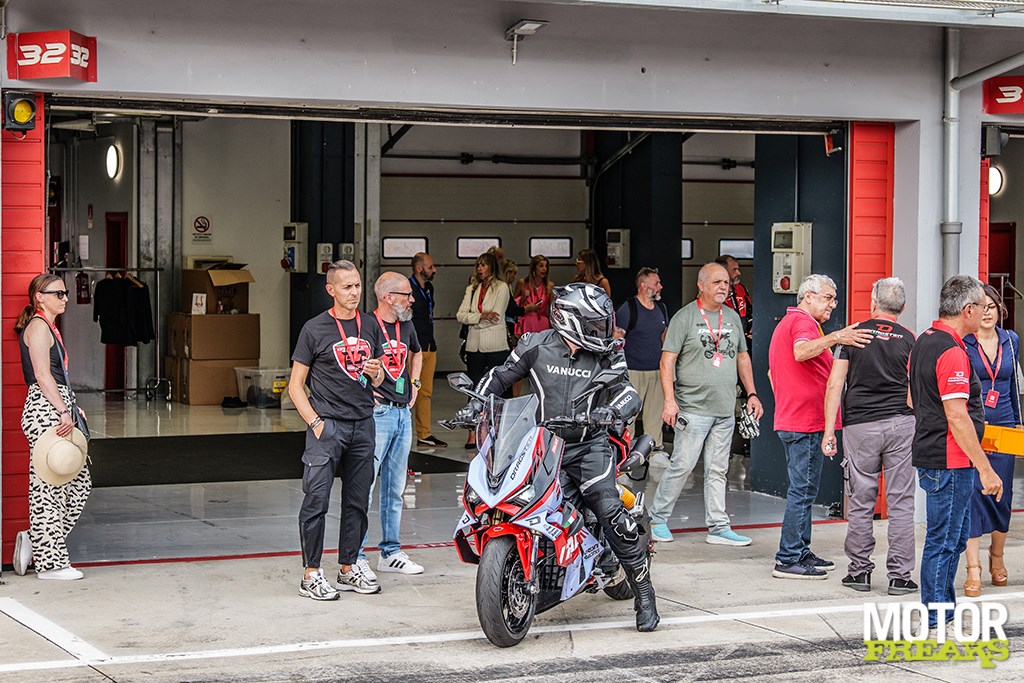 Na een uitgebreide introductie bovenaan de tribune op het rechte stuk – inclusief een spectaculaire demo van Gresini Moto2-rijders Albert Arenas en Darryn Binder – mochten wij zelf het circuit op. Drie rondes op het 4,9 km lange Imola zijn natuurlijk veel te weinig om een compleet oordeel te vellen, maar wel voldoende voor een eerste indruk. En om maar met de