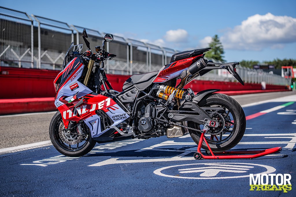 De eerste acceleraties op Imola bevestigen dat. Binnen no-time zie je 160-170 km/u op de teller verschijnen. Onderin is het motorblok - afkomstig van QJMotor - nog niet direct bij de les, maar bovenin de toeren komt de spreekwoordelijke beer los. Het is misschien allemaal relatief, maar door de rechte zit, de schelle toon uit de einddempers in combinatie met het rood oplichtende