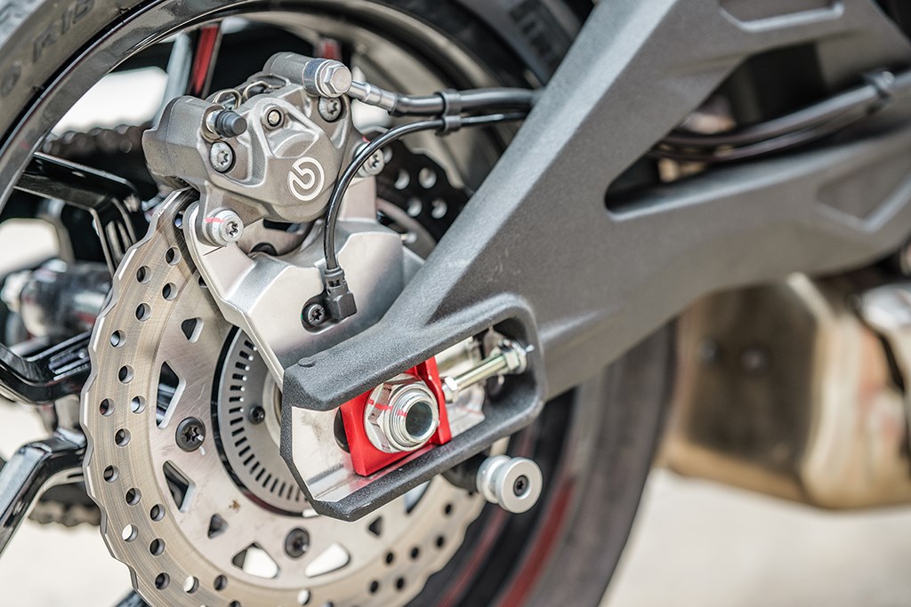En zo snel als dat die drie rondes voor mij omvlogen, zo snel weten de dubbele Brembo schijfremmen ook de Dragster 700 een halt toe te roepen. De voorrem is daarmee ook nog eens goed te doseren en er zit een prettige ‘bite’ in het remsysteem als je de hendel wat dieper inknijpt. Die hendel is overigens net als de koppelingshendel in meerdere standen te verstellen en dat is prettig. Waar ik wel even aan moest wennen was de positionering van de voetrem, die ook voor mijn maatje 43 net even te ver van de voetsteun geplaatst stond. Een blik op het pedaal leert echter wel snel dat ook deze verstelbaar is en het uiteinde wat verder naar achteren geschoven kan worden.