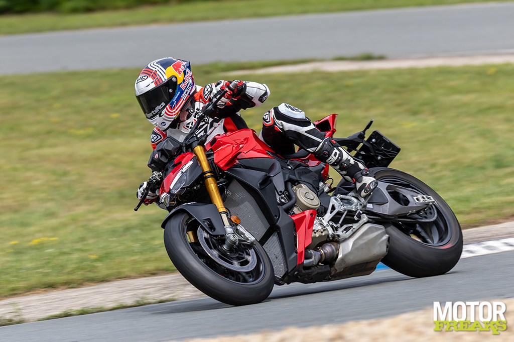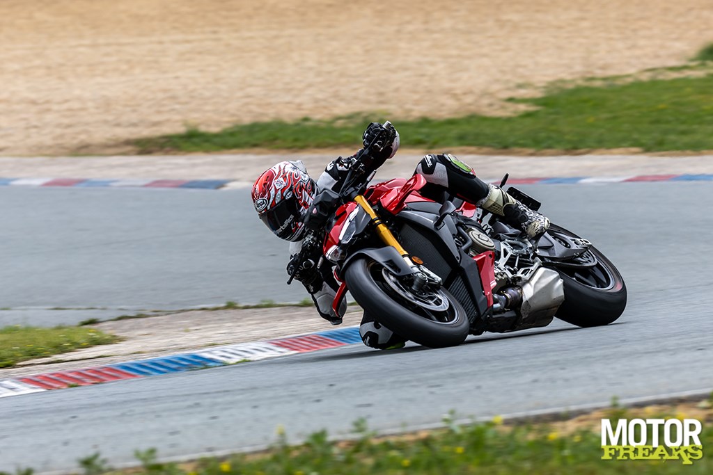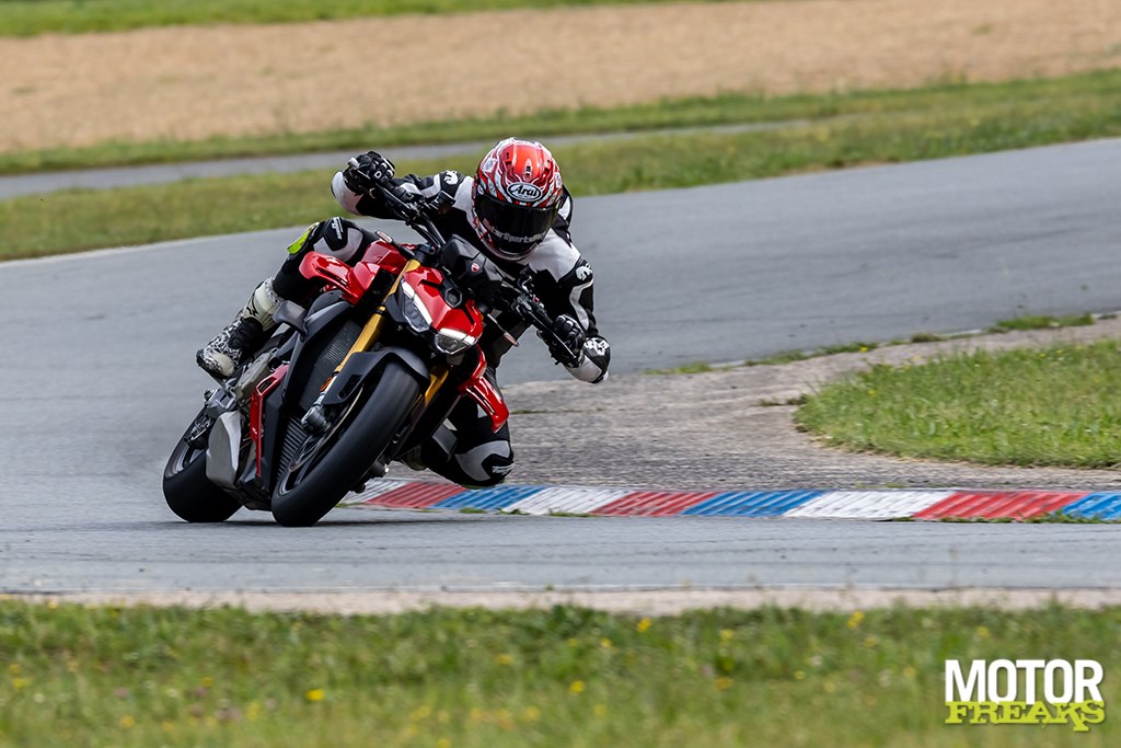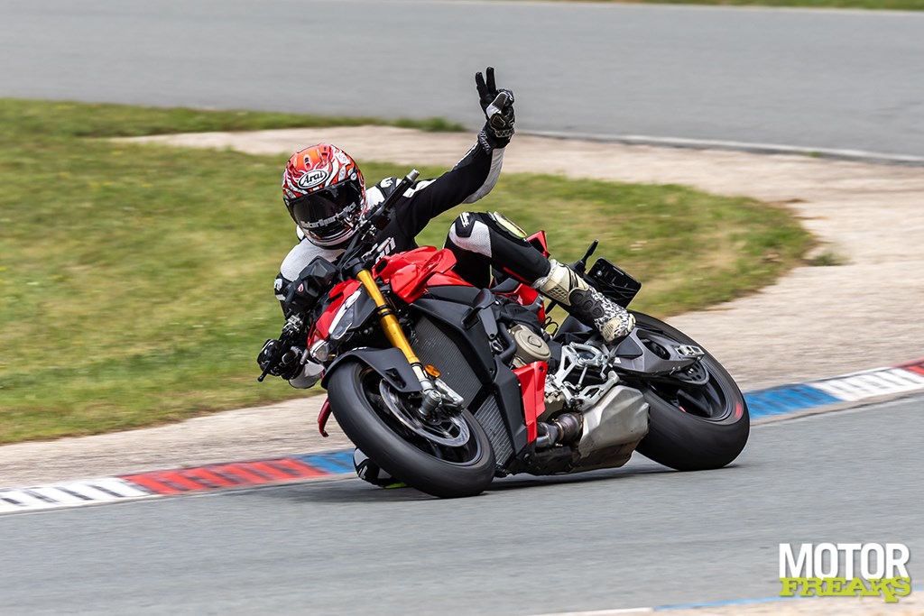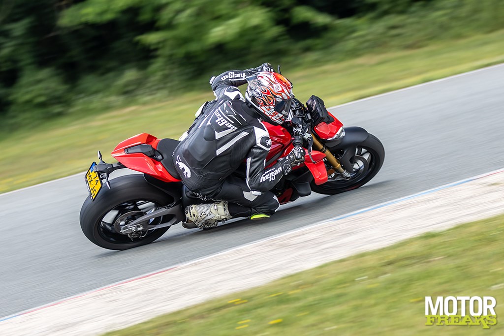 Wat opvalt: de Streetfighter voelt minder vermoeiend. Waar de 2023-versie je na een half uur liet hijgen, kun je nu langer doorgaan. De voorkant blijft rustiger, het achterwiel beter aangesloten. Je kunt hem dieper de bocht in gooien en eerder openzetten. De grenzen vervagen.