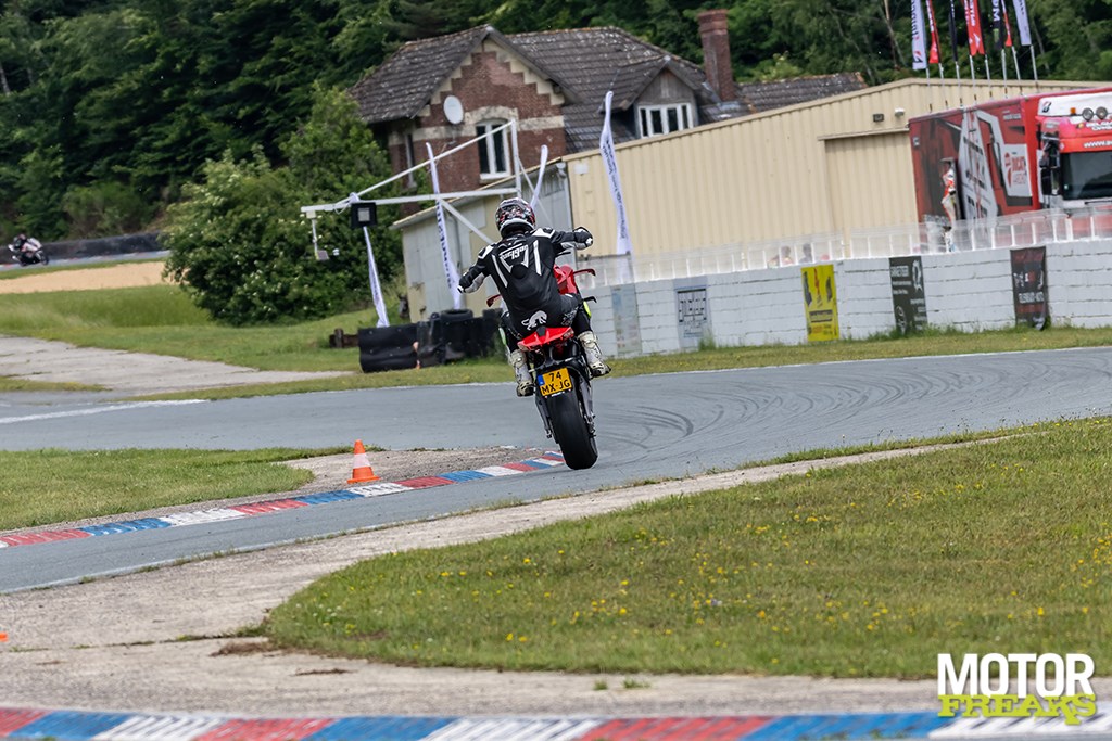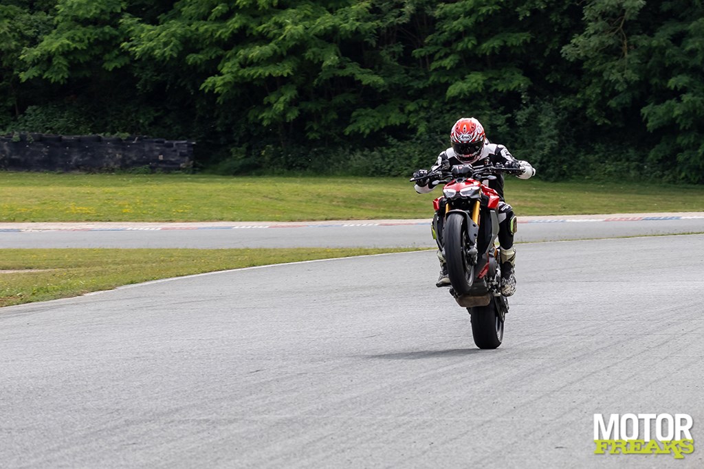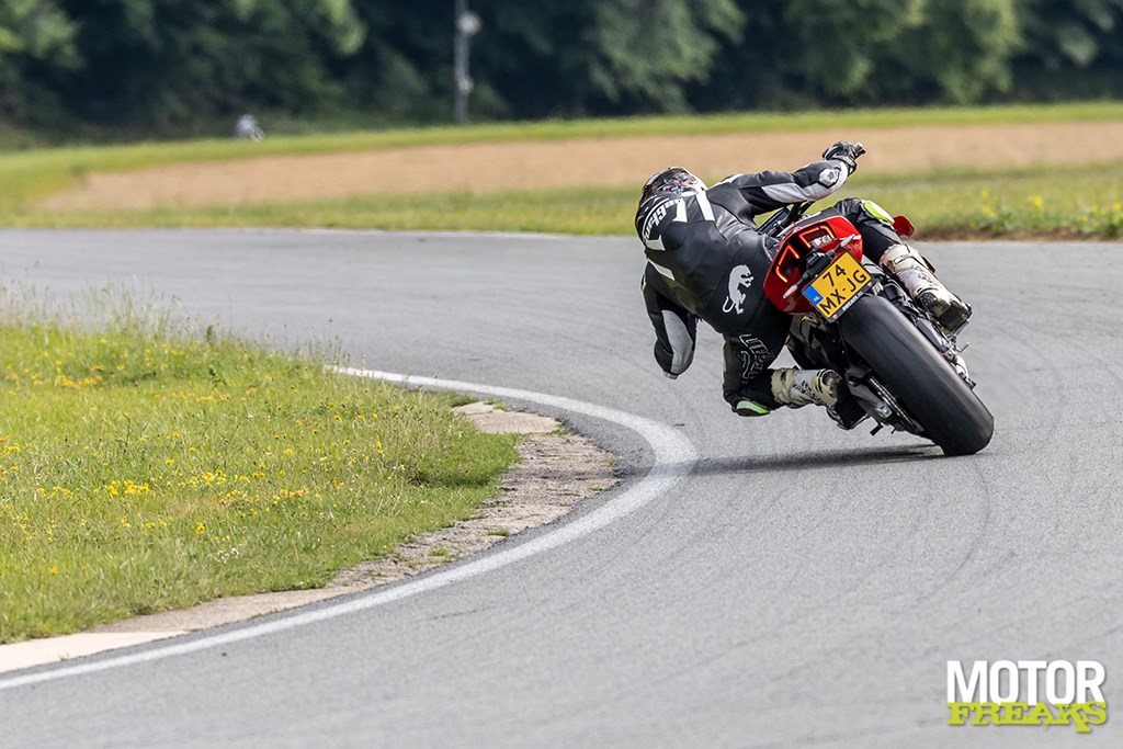 Race-modus aan. Tractiecontrole omlaag, wheeliecontrole uit, vering in “Active Track”. Klaar voor serieuze arbeid. Folembray heeft maar een paar plekken waar je vol open kunt, maar daar waar het kan — uit de snelle chicane naar start/finish, of het kleine stuk richting bocht 7 — lijkt de Streetfighter zichzelf te lanceren. De 200/60-achterband (Pirelli Rosso IV Corsa) grijpt zich vast als kauwgom, maar zonder wheeliecontrole is het vechten.