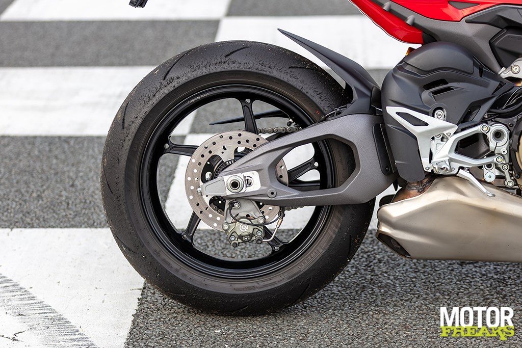 Onder dat blok hangt een volledig nieuwe dubbelzijdige “Hollow Symmetrical Swingarm”, geïnspireerd op de Panigale V4 R. Die is 43 % minder lateraal stijf dan de vorige enkelzijdige variant, maar wel lichter, en dat voel je. De achterkant werkt levendiger, geeft meer gevoel bij accelereren uit bocht 4 of bij het corrigeren over de hobbelige apex van de chicane.