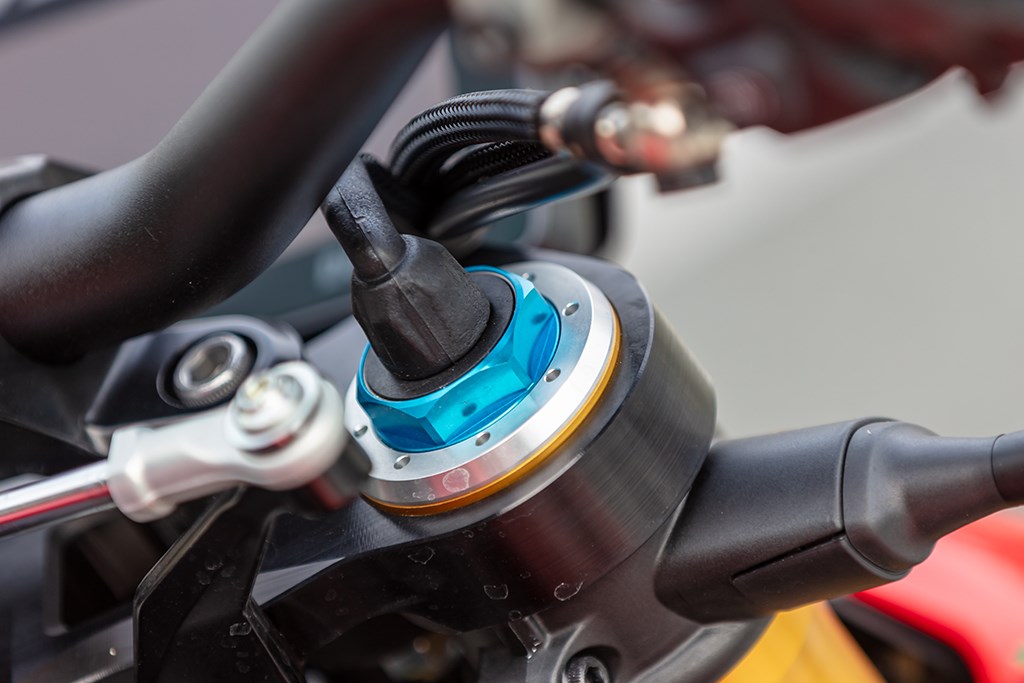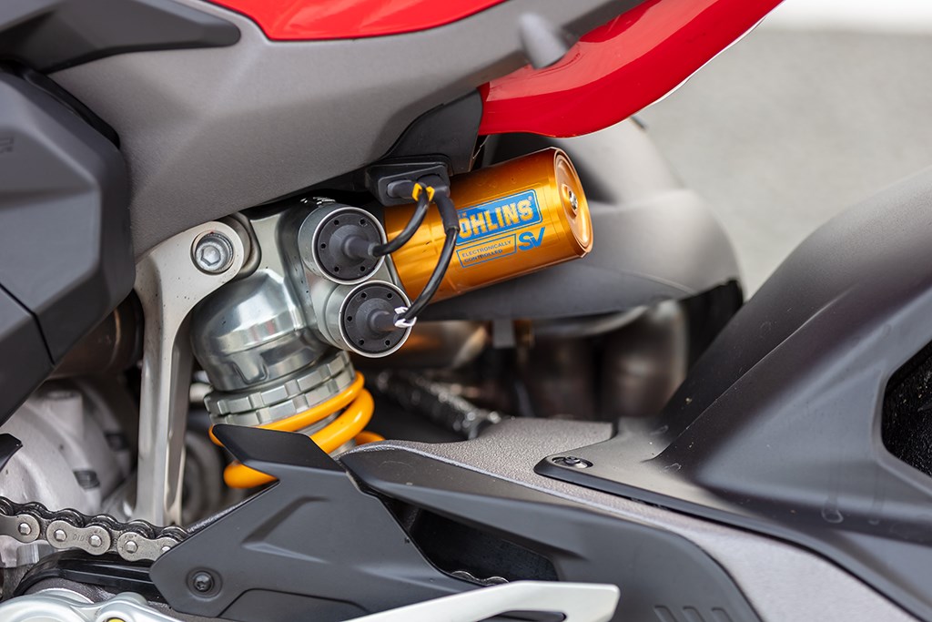 De Öhlins Smart EC 3.0-vering is een wonder op zich. De hydraulische kleppen zijn nu van het zogeheten spool-type, sneller reagerend en met een breder afstelbereik. Het systeem leest niet alleen acceleratie en remkracht, maar ook je tempo: dankzij de *Cruise Detection*-strategie wordt de vering zachter bij constante snelheid, ideaal voor snelwegtrajecten.
