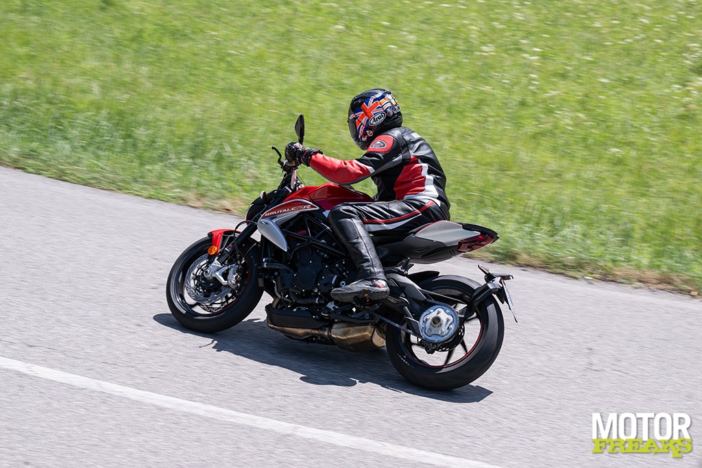 Dat klopt als een bus. Optisch dan hè, want onderhuids is dit toch echt Brutale 2.0 in de bochten van de prachtige bergwegen waar Mario me langs leidde (en hem niet uit het oog te verliezen) moest ik behoorlijk door de versnellingsbak roeren om de motor boven de 7.000 tpm te houden, waardoor ik constant door dat fantastische geluid werd vergezeld.