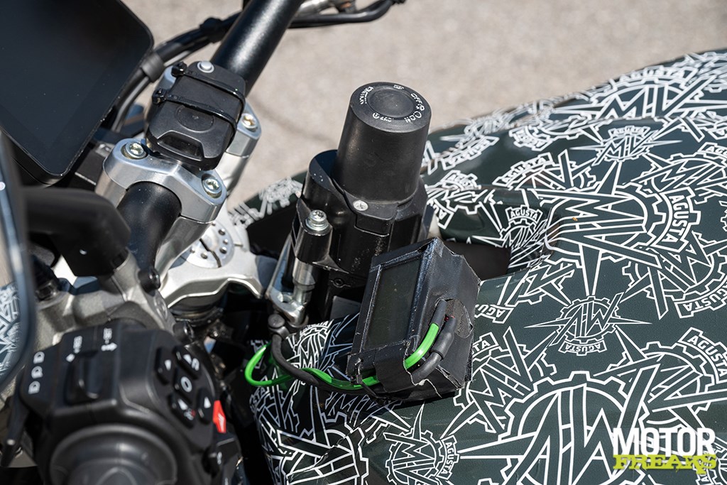 Prototype P2 was een stap verder in het ontwikkelingsproces, vandaar de camouflagekleurstelling die het 950 Brutale-chassis en de carrosserie sierde, uitgerust met de nieuwste versie van de vernieuwde motor. Versierd met diagnoseapparatuur en allerlei bedrading viel hij al van mijlenver op als iets geheimzinnigs, maar toch zag ik maar één man zijn smartphone tevoorschijn halen en een foto van mij maken tijdens de paar uur dat ik op de motor reed in wat zeker wel een van-dik-hout tempo mag worden genoemd, rijdend achter MV-tester Mario op zijn favoriete “Racer Road”, terwijl Federico Macario het tempo aardig wist bij te houden – nou ja, meestal dan!