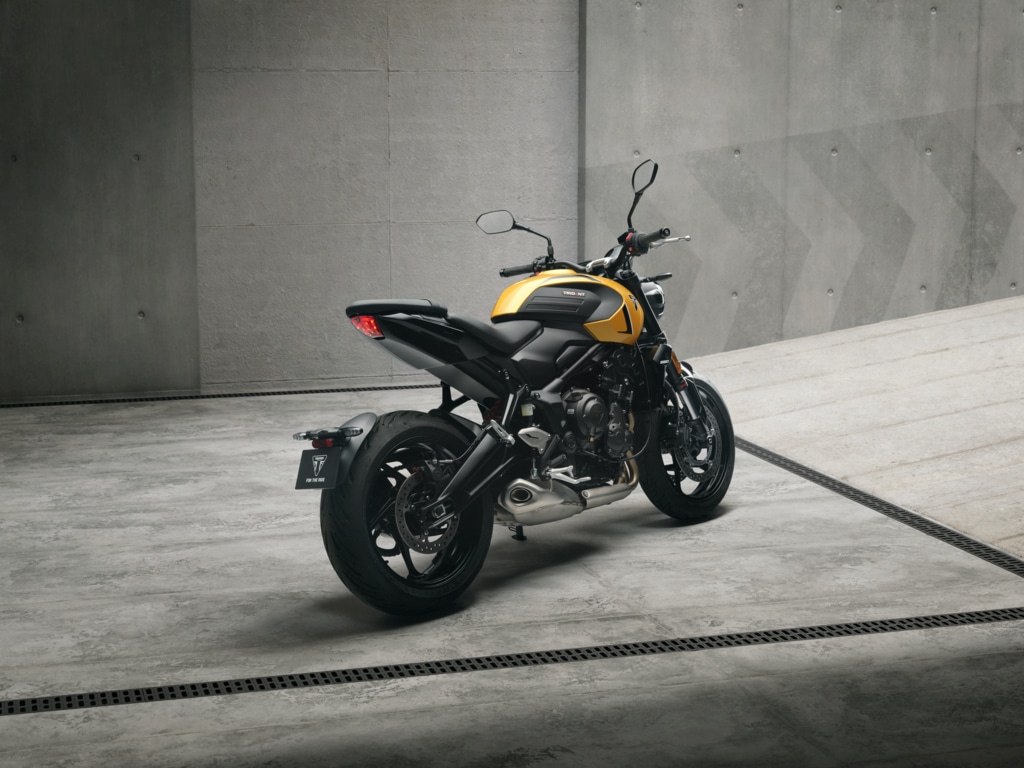 De motor heeft een reeks hardware-updates gekregen, waaronder drie afzonderlijke 44mm gaskleppen (één per cilinder) in plaats van een enkele gasklep, een grotere luchtinlaat, een aangepaste cilinderkop met grotere uitlaatkleppen en een aangepast nokkenasprofiel met meer lift. Het resultaat is volgens Triumph een levendigere top-end en een karaktervolle motorrespons, perfect voor zowel sportief bochtenwerk als dagelijks gebruik. De nieuwe 3-in-1 uitlaat met geoptimaliseerde katalysator en compacte demper draagt bij aan efficiëntie en het iconische triple-geluid.