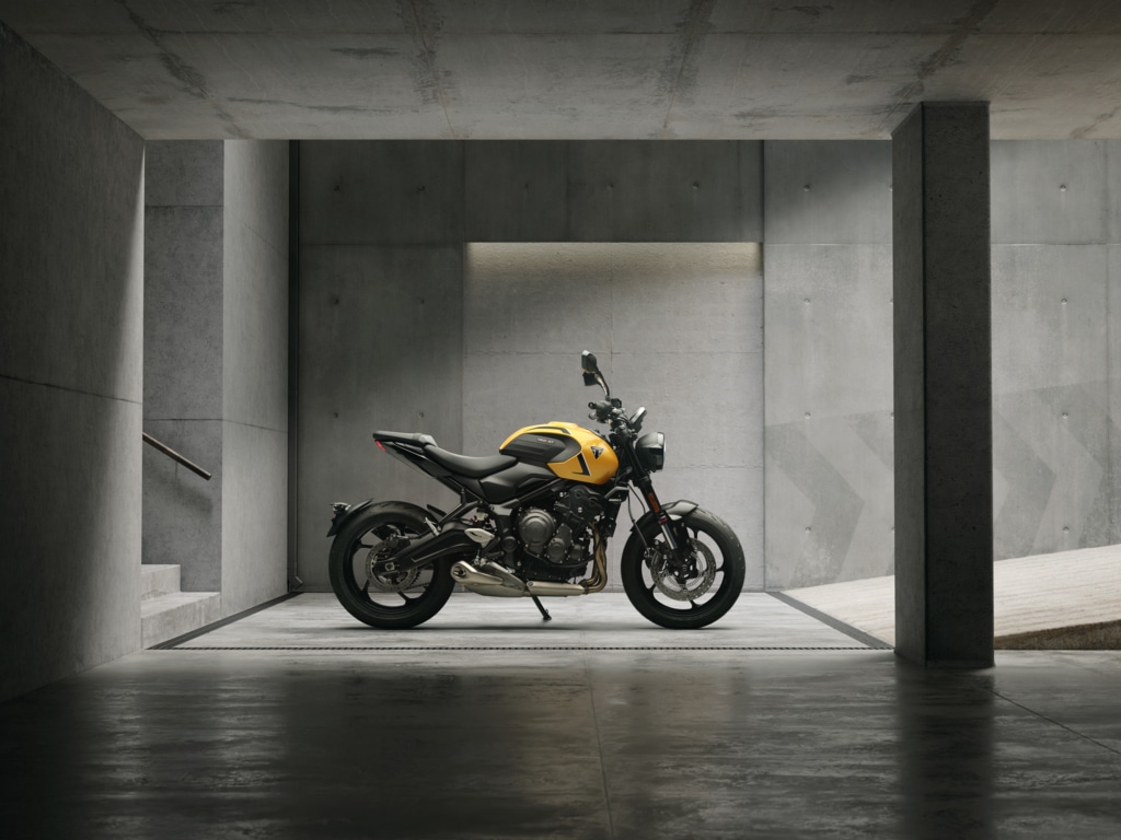 Het design is volledig vernieuwd, met een breder, strak gesneden brandstoftank, nieuwe splitzadelopties en een optionele solo-cowl voor een strakkere uitstraling. Nieuwe LED-verlichting, een herontworpen koplamp en subtiele branding zorgen voor een premium afwerking. Drie kleurenopties – Cosmic Yellow, Stone Grey (premium) en Snowdonia White (standaard) – geven rijders de mogelijkheid hun Trident te personaliseren.