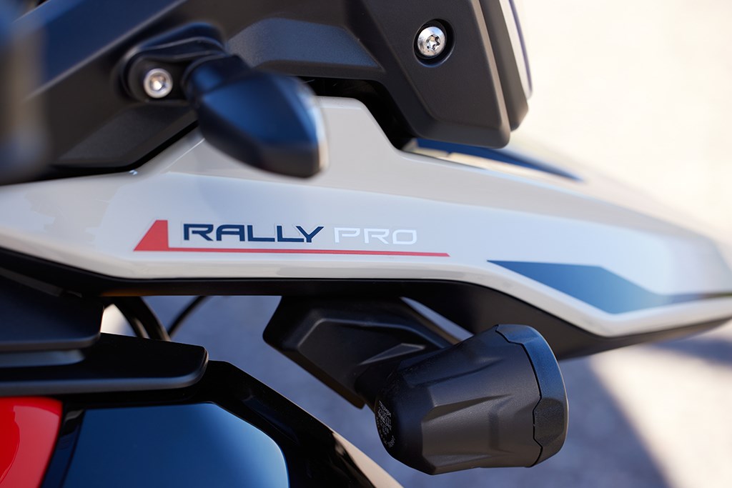 Een nieuw gedempt bevestigingssysteem voor het stuur zorgt voor een comfortabelere rit, plus de verbeterde stuurpositie op de Rally Pro, met het stuur 15 mm dichter bij de rijder, zorgt voor meer wendbaarheid, zowel zittend als staand.