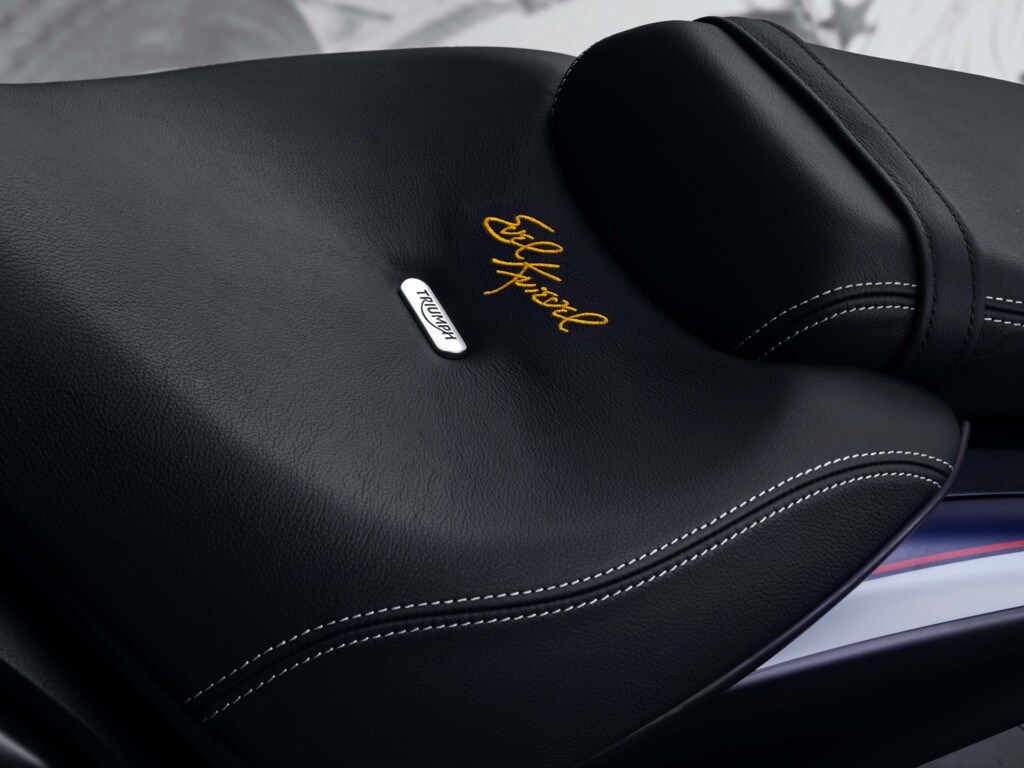 Het exclusieve kleurenschema, met Pure White-accenten en een laagje contrasterend Matt Sapphire Black op het vliegenscherm, de koplampbehuizing, spatborden, zijpanelen en het kuipwerk achteraan, benadrukt de krachtige presence van de motorfiets. Het premium lederen zadel is voorzien van een met goud geborduurde Evel Knievel-handtekening en een verzonken Triumph-badge van geborsteld aluminium, terwijl een Knievel-animatie op het startscherm zorgt voor een op bijzonder welkom telkens wanneer de 2.500cc zware driecilinder wordt gestart.