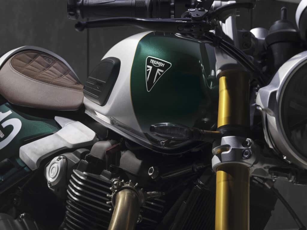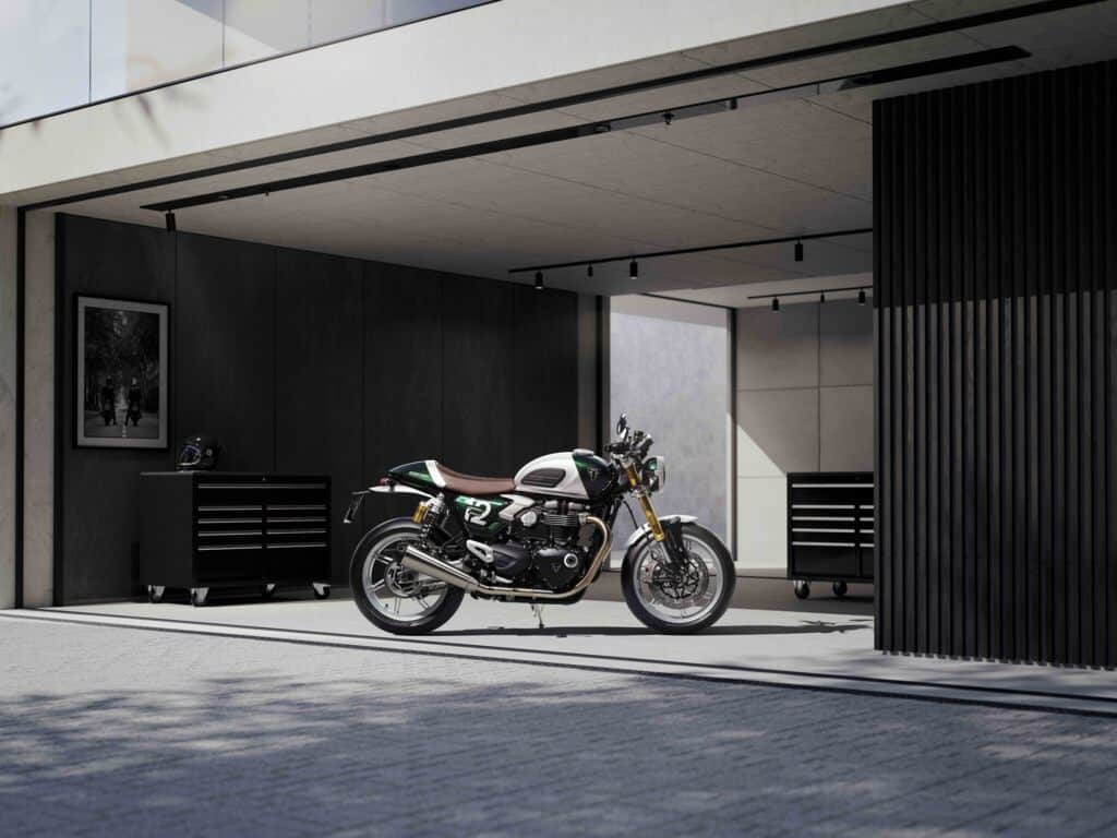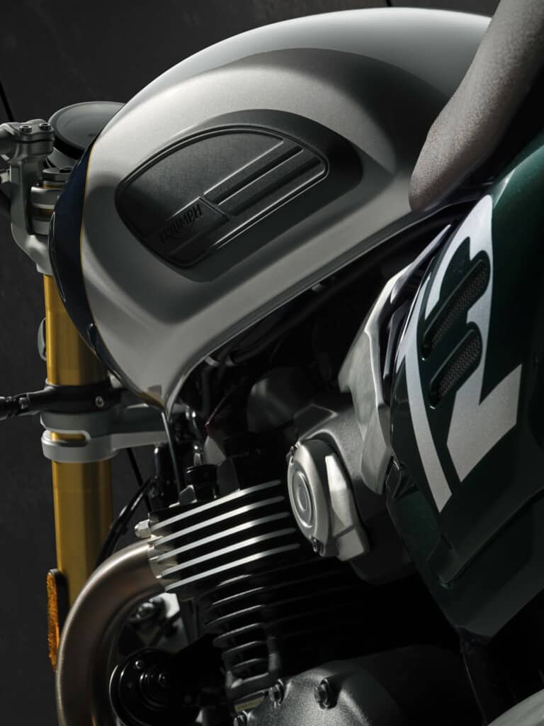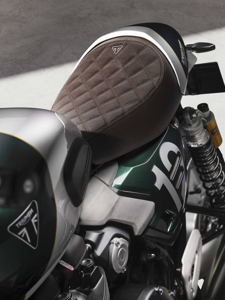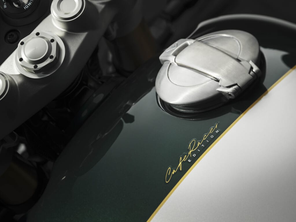 De exclusieve kleurstelling is een van de grote blikvangers. Triumph combineert Competition Green met Aluminium Silver, afgewerkt met een fijne Empire Gold-coachline en subtiele Café Racer Edition-belettering. Ook de wielen zijn in Aluminium Silver uitgevoerd, terwijl de koplampbehuizing, zijpanelen en vorkbeschermers in Competition Green zijn gespoten. Het resultaat is een tijdloos maar uitgesproken sportief totaalplaatje, diepgeworteld in Triumphs racerfgoed.