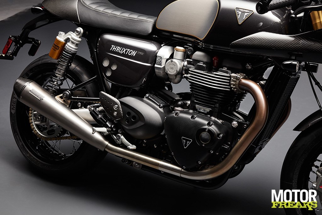 Er is ook een eersteklas uniek uitlaatsysteem voor de Thruxton TFC, met Vance & Hines titanium dempers met eindkappen van carbon, met een uniek met laser geëtst co-branded logo.