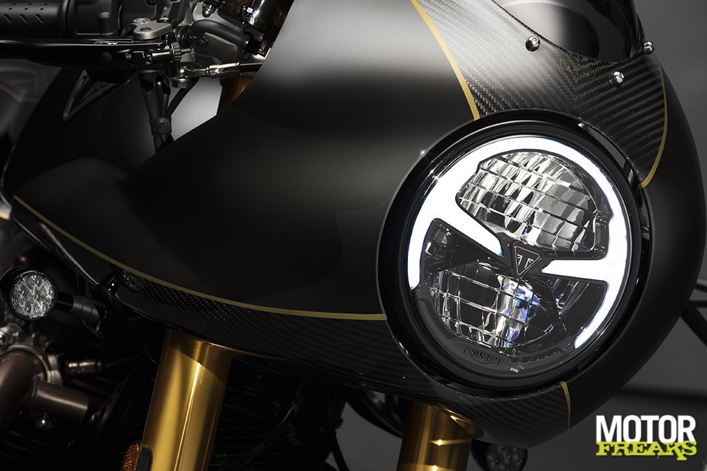 Om het zwarte thema en het echte carbon perfect aan te vullen, is de Thruxton TFC verkrijgbaar in één kenmerkende lakkleur - het opvallende Carbon Black, met geborstelde kniesteunen op de tank en met de hand geschilderde gouden belijning. En die premium gouden accenten