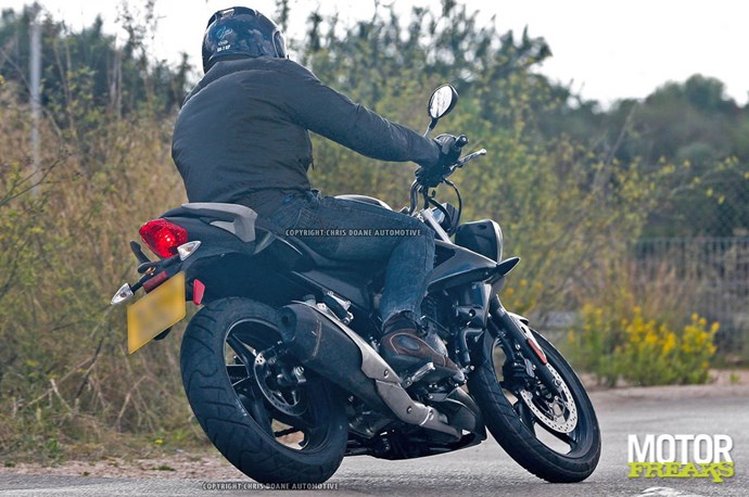 De in Spanje gespotte nieuwe Triumph heeft veel DNA van haar grotere Street en Speed Triple familieleden gekregen, waaronder de dubbele koplamp partij, die het lichte instapmodel tot een direct herkenbare Triumph maken. Erg spannend vormgegeven is de nieuwe naked verder niet, maar dat zal zeer zeker ook niet het uitgangspunt van de Britten zijn geweest.