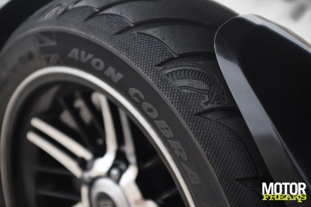Tot zover de overeenkomsten, over naar de dingen die de Rocket 3 R onderscheidend ten opzichte van de Rocket 3 GT maken. We beginnen bij de wielen, die bij de R een mooie zwarte afwerking hebben, waar bij de GT de Britten een stap verder zijn gegaan met een machinale bewerking op de velg en de spaken. Beide modellen zijn trouwens uitgerust met dezelfde Avon Cobra banden die speciaal voor de Rocket 3 zijn ontwikkeld.