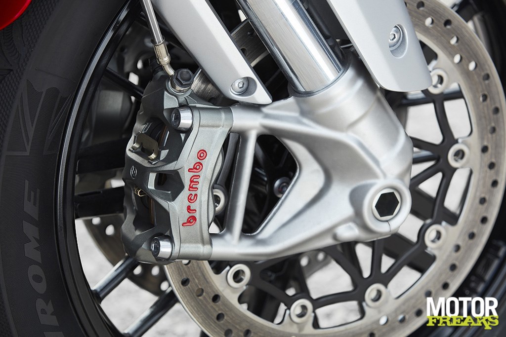 Motorisch gezien hebben we geen verschillen kunnen ontdekken tussen de R en GT en datzelfde geldt ook voor het rijwielgedeelte. Beide modellen zijn uitgerust met een volledig instelbare Showa achtershock met piggyback reservoir en een 47mm Showa upside down voorvork die qua veervoorspanning en uitgaande demping instelbaar is. Om de 291 kilo drooggewicht (294 kilo voor de GT) weer tot stilstand te krijgen zijn Brembo Stylema radiale Monobloc vierzuiger remklauwen voorzien en dat zijn zo'n beetje de beste remmen die op dit moment voor consumenten te koop zijn. Trouwens, nog even dit voor wie 291 kilo achterlijk zwaar vindt: het is meer dan 40 kilo minder dan de oude Rocket III.