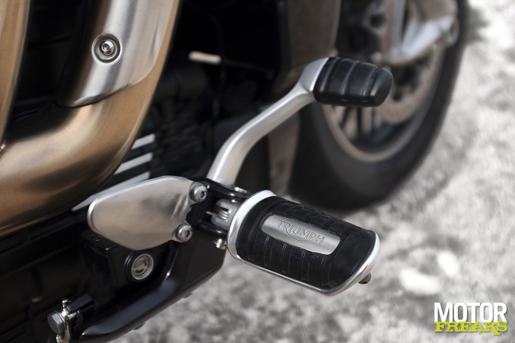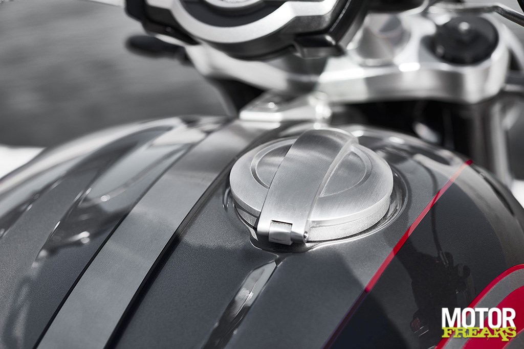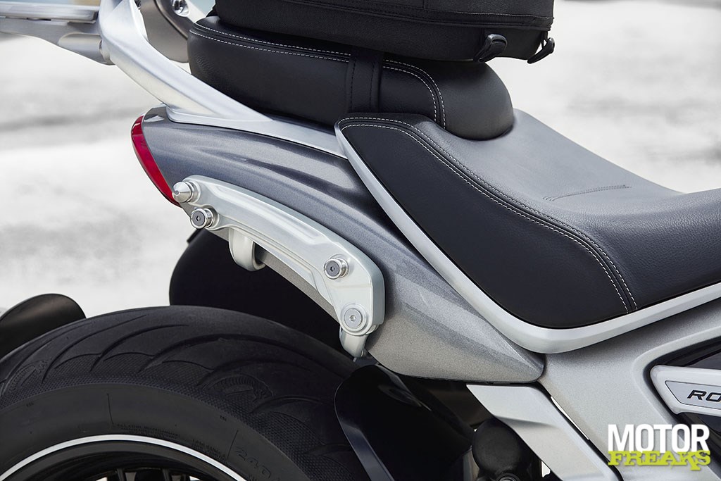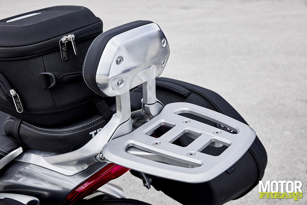 heeft met een nog toegankelijkere zithoogte van 750 mm. De Rocket 3 GT is bovendien uitgerust met een rugsteun van geborsteld aluminium.