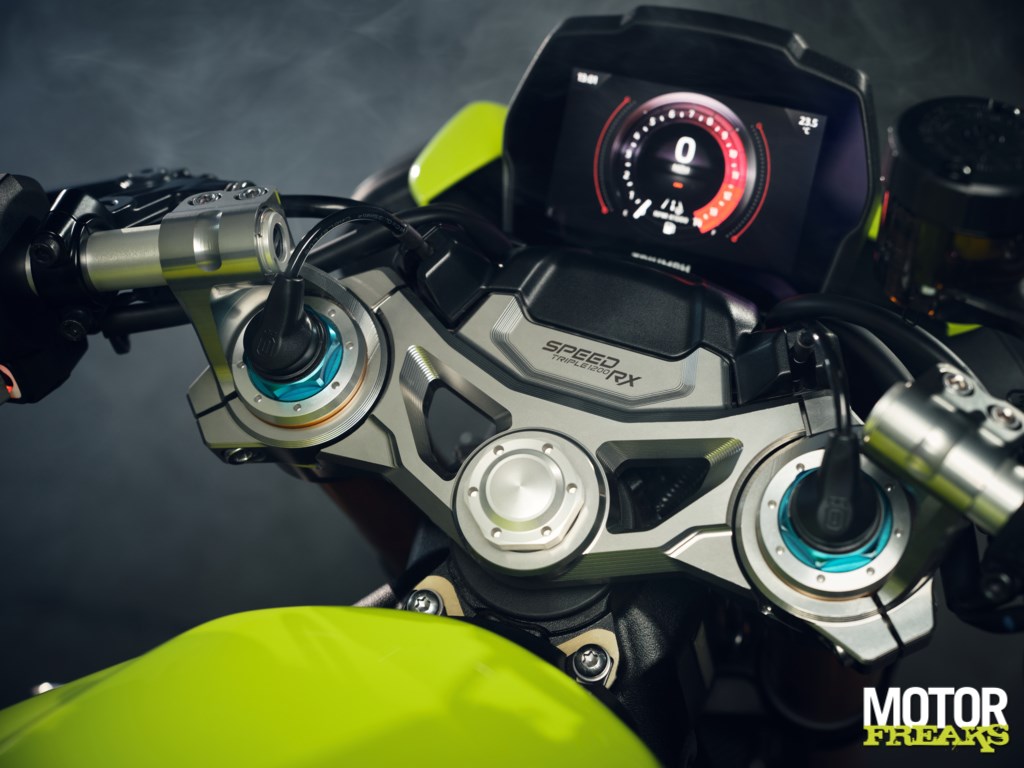 Dat Triumph bij de nieuwe Speed Triple 1200 RX de focus nog meer op het circuit heeft gelegd blijkt alleen al uit het feit dat het brede stuur het veld heeft geruimd voor in de kroonplaat gemonteerde clip-ons. Volgens Triumph staan deze 69 mm lager en 52 mm verder naar voren dan het stuur van de RS. En dat is niet het enige, Triumph heeft ook de voetsteunen 14,5 mm hoger en 25,5 mm verder naar achteren geplaatst.