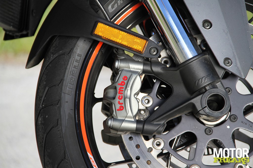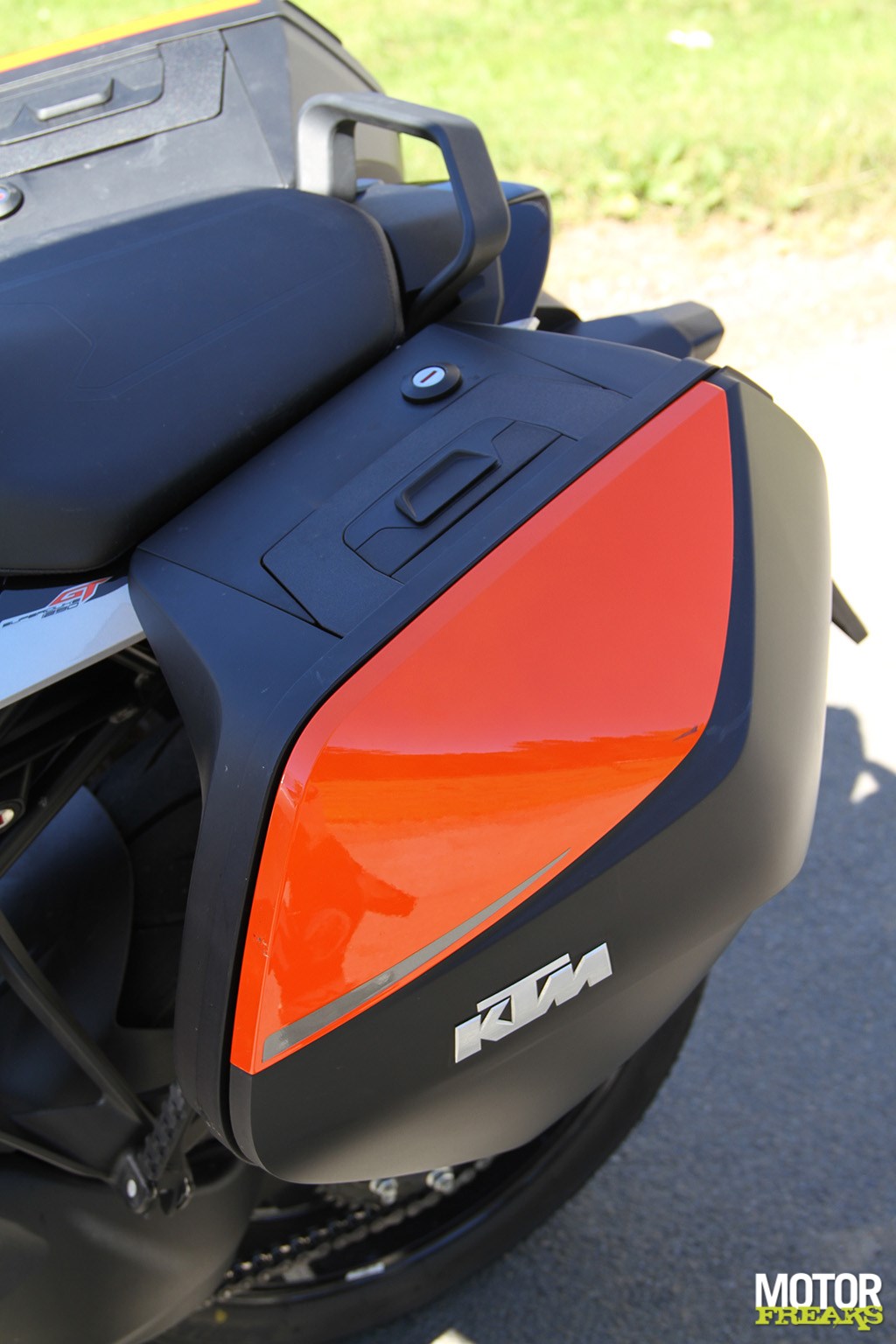Nou is het zo dat beide motoren zijn uitgerust met een elektronisch instelbare vering, maar in het geval van de KTM is dat gekoppeld aan een batterij sensors rondom de motor, inclusief eentje die de hellingshoek, acceleratie of remmen meet en daar op kan reageren. Zo werkt dus ook het hellingshoekafhankelijke bochten-ABS en de tractie controle samen met de vering, die van al die input het beste maakt.