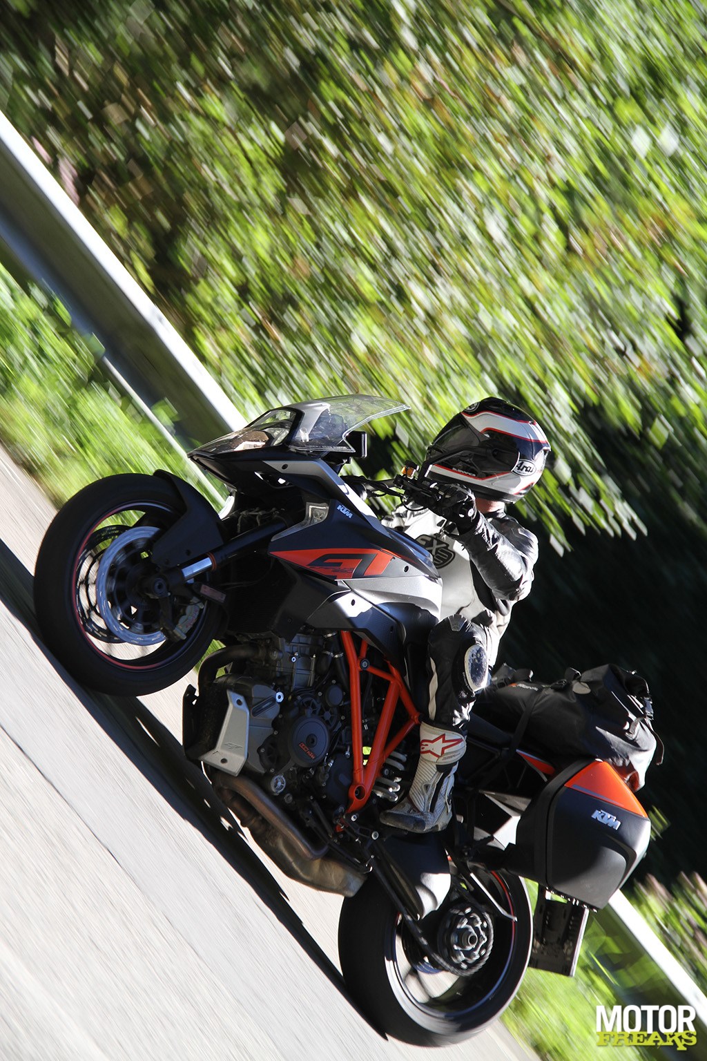 Een 1290 Super Duke R, maar dan met koffers en een hoge ruitTot die tijd schakel je nog gewoon op de ouderwetse manier terug en dat werkt zoals altijd ook nog steeds prima. Sterker nog, de bak schakelt zó goed dat je je nog kunt vergissen en denken dat het ook terug omlaag wél kan. Maar dat werkt maar tot op zekere hoogte, op het circuit gaat het je echt niet lukken.