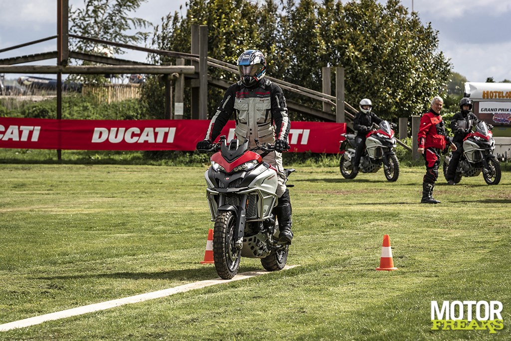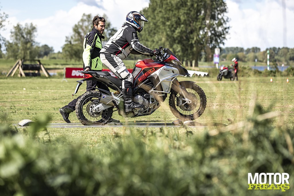 Het zadel van de Multistrada 1260 Enduro is comfortabel en zolang ik daarop naar Beppe zit te luisteren is alles prima. Toch komt er zelfs bij deze extraverte Italiaan een punt dat hij niks meer te zeggen heeft en dat we op een grasveld in Maurik tussen een reeks uitgezette pylonen het beluisterde in de praktijk moeten brengen. De groep cursisten rijdt langzaam achter elkaar een slalom, staand op de voetsteunen, de armen strekkend en de kont heen en weer wiegend, als een kudde vrolijke olifanten die de twist doen terwijl ze over de uitgestrekte steppes sloffen. Ik blijk meer spieren te hebben dan ik dacht. Dan heb ik het niet over de kracht, maar het aantal waarvan ik niet wist dat ik ze had. Dat ik die de volgende ochtend ga voelen is mij vrij snel duidelijk, en dat ik een stijve hark ben ook.