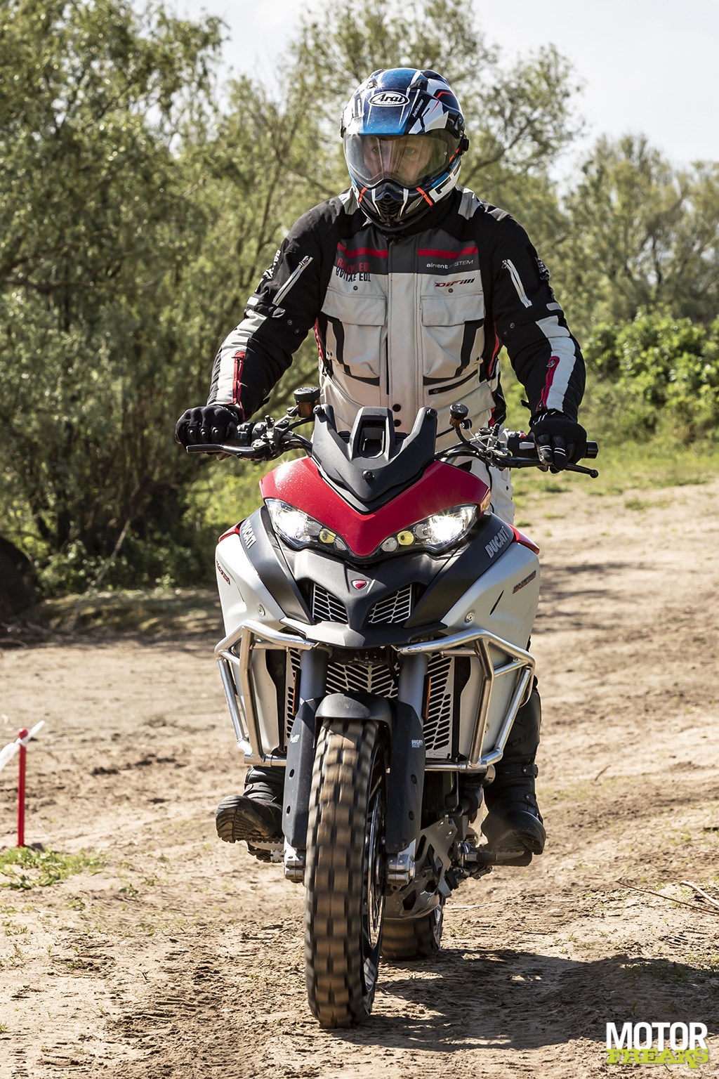 Het tweede agendapunt is hetgeen waar ik het meest naar uitkeek en het meest tegenop zag: offroad met de 254 kg wegende 1260. Beppe legt meteen uit dat je alles wat je van offroad-rijden weet moet vergeten. Niet blijven zitten, je poot uitsteken en de motor opvangen als hij gaat glijden. Dit gewicht houd je niet als het gaat glijden. Als dat gebeurt, kun je het zinkende schip beter verlaten, wegspringen en je vege lijf redden. Bij dit soort motoren blijf je ten allen tijden op de voetsteunen staan. Waar het om gaat is dat je de motor in de bochten onder je laat wegkantelen, terwijl je zelf je luie derrière en bovenlijf in tegenovergestelde richting beweegt zodat het zwaartepunt van de motor/rijder-combinatie ten allen tijden boven het contactvlak van de banden