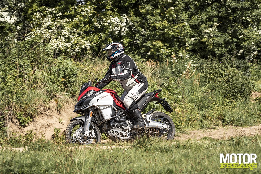 Toch zijn er diverse fabrikanten die de klanten proberen te overtuigen van het feit dat hun motor echt geschikt is voor het terrein. Vaak brengen ze dan zelfs een speciale versie uit, die de naam “enduro” meekrijgt. Speciaal gemaakt voor het terrein dus, wat mijn gelijk over de standaard “allroads” meteen bewijst, want die zijn dat blijkbaar niet. Maar goed, kijken we bij Ducati naar de nieuwe Multistrada 1260 Enduro, dan zien we een motorfiets met een maximum vermogen van 158 pk bij 9.500 tpm en een maximum koppel van 128 Nm bij 7.500 tpm, dus genoeg om 1200 kg zware caravan kg de heuvels achter Luik op te trekken. Daarmee moet je in het terrein dus ook best van onderuit een heuveltje op kunnen ploegen. De veerwegen van de elektronisch geregelde Evo Skyhook Suspension mogen met 185 mm voor en achter wel 65 mm boven die van een gewone straatmotor liggen, dat is echter nog altijd 115 mm minder dan mijn KTM EXC 450. Maar voorzien van de gerenommeerde, ruige Metzeler Karoo M&S banden ziet het er ruig uit. Blijft het feit dat het ding volgetankt net iets meer dan een kwart ton op de schaal brengt.