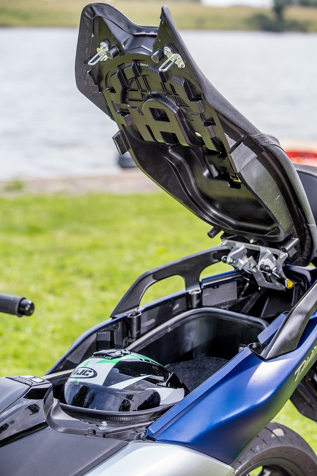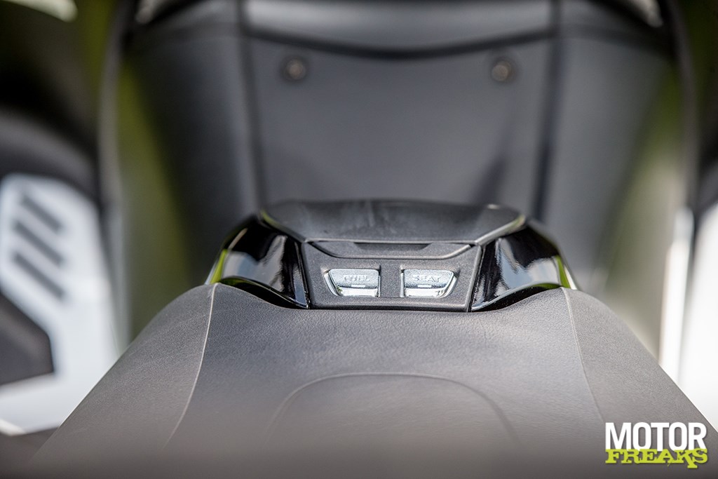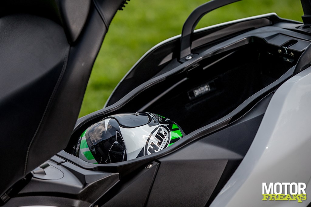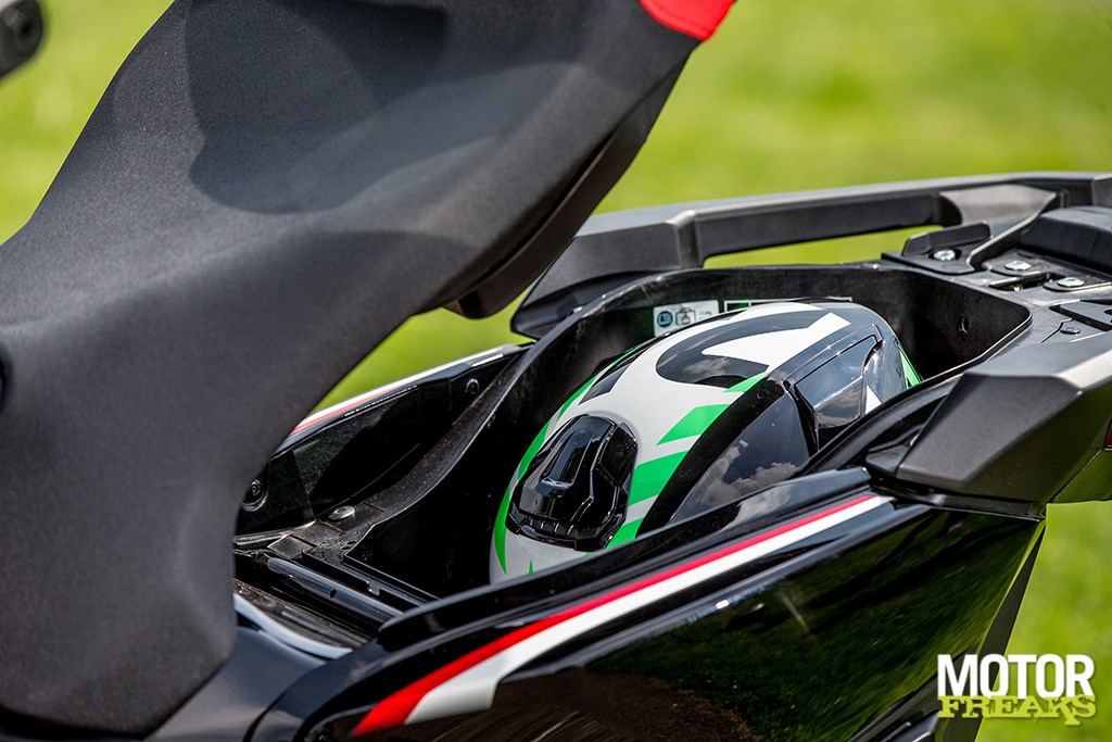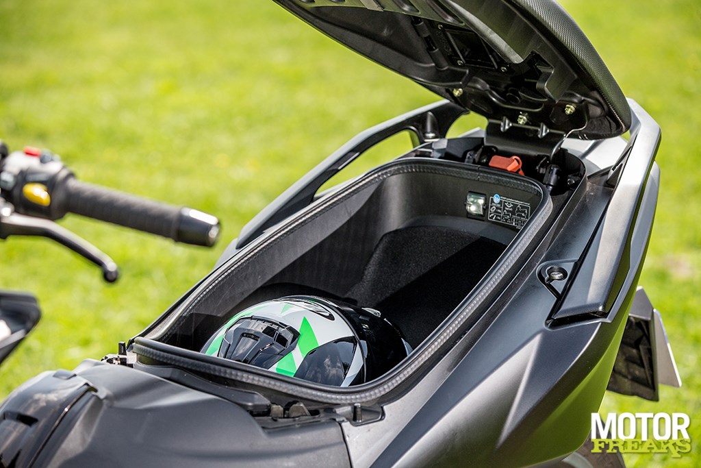 Onder het zadel vind je een zee aan opbergruimte waar we makkelijk een rugzak, schoenen en een jas in kwijt kunnen. Het is wel jammer dat de het opbergvak zo is gedimensioneerd dat je er geen twee integraalhelmen in kwijt kan. Een tweede helm kunnen we weliswaar in de topkoffer opbergen, maar niet iedereen zal deze laten monteren.