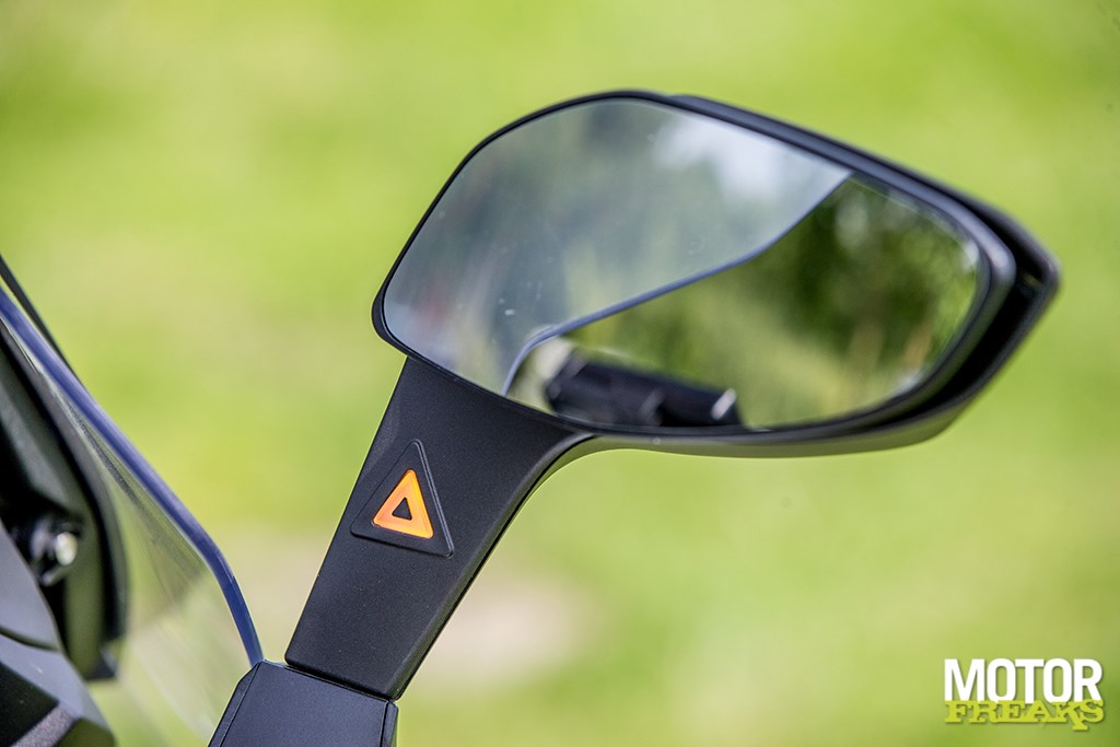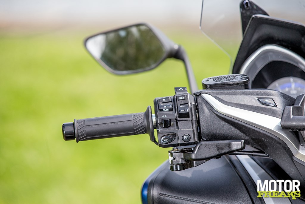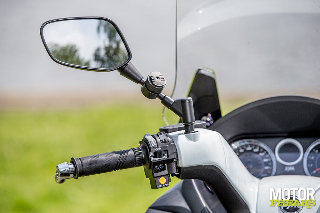 In het stadsverkeer is de breedste van de bende het moeilijkst door kieren en gaatjes in de verkeersstroom te manoeuvreren, waardoor je net iets minder makkelijk de polepositie aan de stoplichten kan opeisen. De ruimere afmetingen zorgen er wel voor dat je bij vlotter snelwegverkeer het meest op je gemak zit. Het windscherm is met een druk op de knop automatisch in hoogte verstelbaar en doet zijn werk meer dan behoorlijk. Onder het scherm vind je tevens twee flappen die je ingeklapt of uitgeklapt kan gebruiken, en die je handen van de rijwind moeten afschermen. Bij warm weer kan je ze ingeklapt laten om je vingers van een beetje tocht te voorzien,