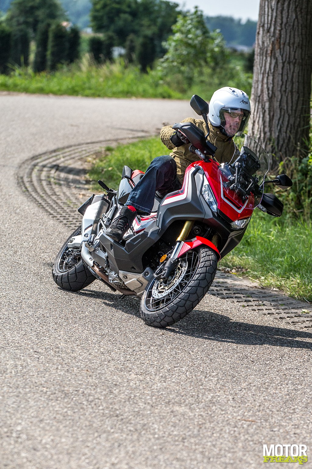 Maar dan het rijden zelf: het brede stuur geeft je al meteen een gevoel van controle en met de volledig instelbare hendels – achterrem links, voorrem rechts – zet je alles haarfijn naar je hand. Vanuit stilstand vertrekken of manoeuvres uitvoeren doe je best met slepende achterrem want de aandrijving reageert eerder strak op elke millimeterje gas. Eens je wat snelheid haalt is de controle optimaal en hoeft dat niet meer. Ondanks het 17 inch voorwiel stuurt de X-ADV lekker licht,