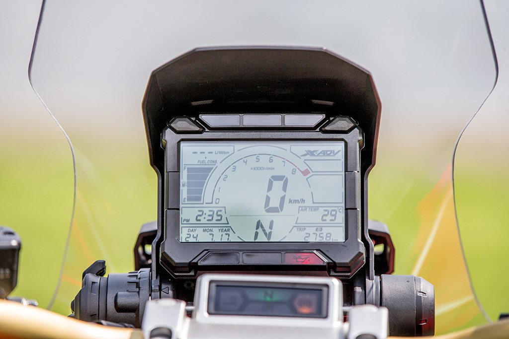Het zadel is met 820 mm best hoog te noemen maar wat nog meer opvalt is dat het hard aanvoelt. In combinatie met de sportief strak afgestelde vering levert dat na een dag rijden, stoppen, op- en afstappen een wat pijnlijk zitvlak op. Vooral bij het neerzetten van je voeten voel je de harde randen, want je moet echt wel nadrukkelijk naar de grond reiken om stevig je voeten te kunnen neerplaatsten. Rijders kleiner dan 1m70 zullen daar beslist een probleem mee hebben. Waar zij wel blij zullen mee zijn is met het vijfvoudig instelbaar windscherm dat ondanks zijn smalle voorkomen echt goed presteert. Bij rijders tot 1m80 neemt het in de hoogste stand de rijwind netjes weg tot bovenaan de helm, al voel je zijdelings wat turbulenties. Het zicht op het dashboard is er ondertussen eentje om duimen en vingers bij af te likken. Het net als bij de echte enduromachines hooggeplaatste LCD-scherm