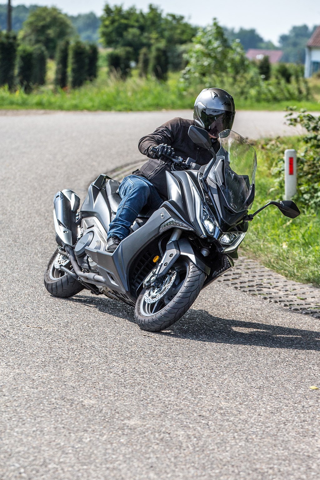 Als we de bediening eenmaal onder de knie hebben, kunnen we aardig aan het gassen, waarbij de 530 cc grote paralleltwin ons aangenaam verrast. Met 46 pk en 53 Nm aan boord is het geen racemonster, en toch laten we letterlijk elke motor achter ons als we aan de verkeerslichten even de Johnny in ons bovenhalen en vol op het gas gaan. Bij een vergelijkende acceleratietest moet de Yam de duimen leggen voor de snellere Kymco en X-ADV, maar hij staat uitstekend z’n mannetje en haalt met flitsend gemak de 155 km/u. Zowel aan dergelijke snelheden als aan een slakkengangetje valt op hoe eenvoudig de 216 kilogram zware TMAX zich van z’n ene op z’n andere oor laat gooien – noch de Dunlop Sportmax Roadsmart 3’s, noch de heerlijk afgestelde vering laten zich ook maar op een foutje betrappen, waardoor we als een vers geslepen bijl door het maccadam klieven. Top! Een lijn die de TMAX doortrekt wat betreft de ankers aan boord: