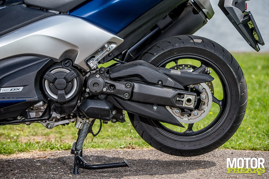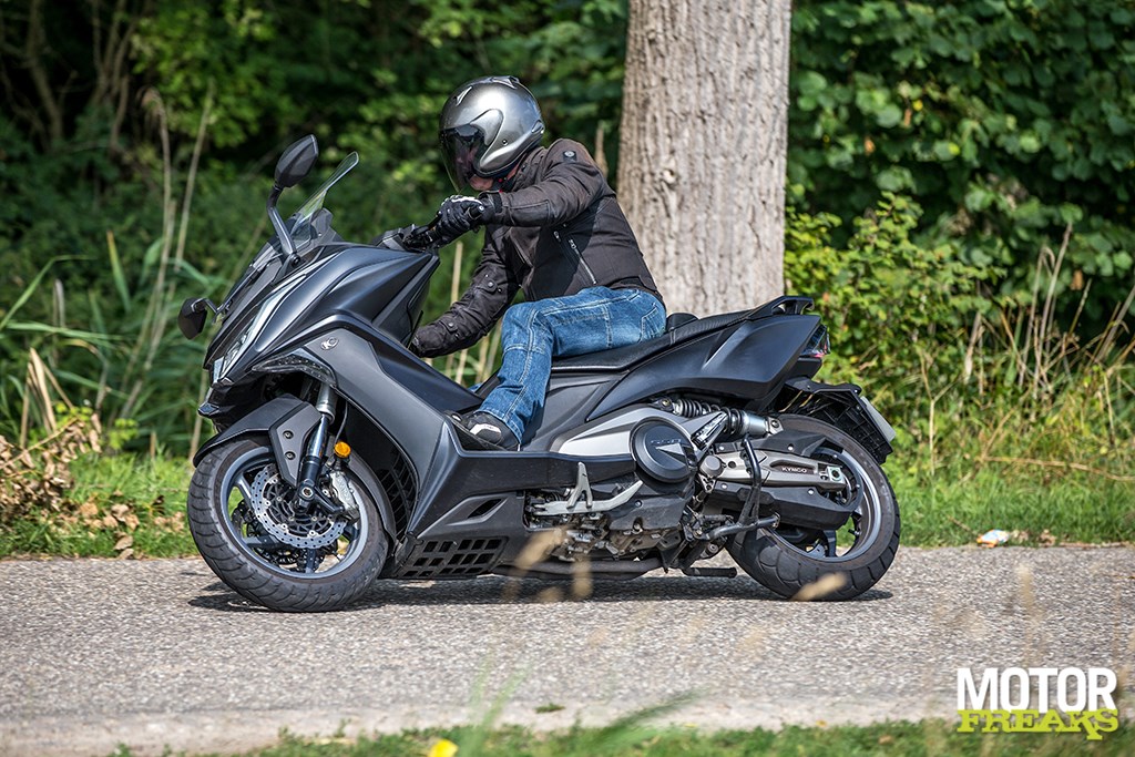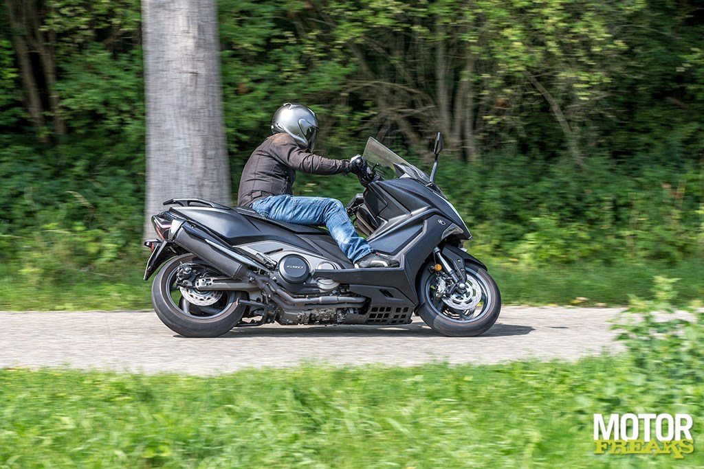 Stiekem best wel tof, dat Nederlandde dubbele radiaalremmen vooraan en de enkele klauw achteraan trekken repen asfalt uit het wegdek en brengen de TMAX perfect gecontroleerd tot een halt, zonder dat je het bloed uit je vingers hoeft te knijpen. Wat ankers betreft scoort enkel de Kymco nog net enkele centimeters beter op de remafstand – maar da’s mekkeren in de marge.
