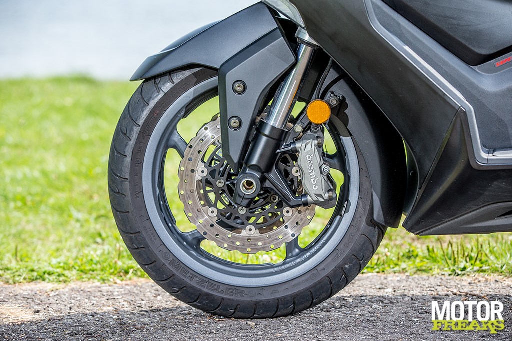 Ga denk ik nog vlug een extra rondje doen(of recht naar voren in de cruiserzit) anders zou je zweren dat je met een normale motor aan het knallen bent. Op het krappe werk is de AK550 dankzij z’n 15” wielen vliegensvlug, terwijl de sportief afgestelde vering de Kymco ook in snelle bochten overtuigend stabiel maakt. Keerzijde is wel dat de AK in de binnenstad vol kinderkopweggetjes oncomfortabel aanvoelt, maar dat nemen we graag voor lief. Iets meer comfort zou wenselijk zijn geweest, maar echt storend is het niet. Ook aan grondspeling ontbreekt het de AK550 niet, hoezeer ik ook m’n stinkende best heb gedaan ben ik er niet in geslaagd iets aan de grond te rijden. Ook de vierzuiger Brembo monoblocs sluiten naadloos aan bij het sportieve karakter van de AK550: ondanks de lekkere bite nog steeds goed te doseren en bovendien bij de remproef vanaf 70 km/u goed voor de kortste remweg van dit vijftal. Puik.