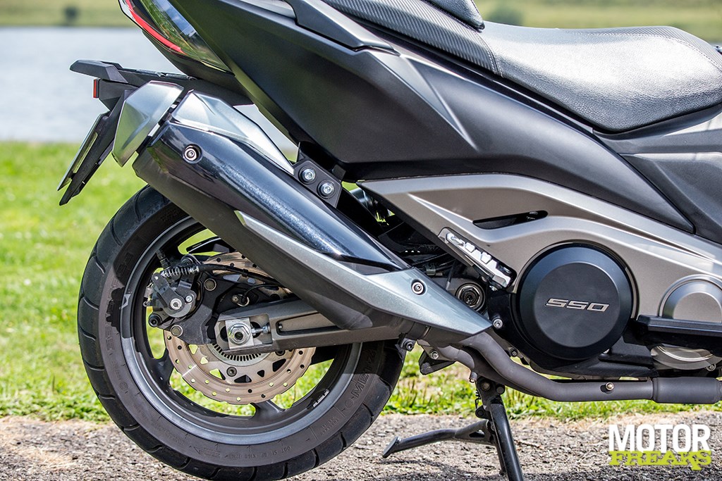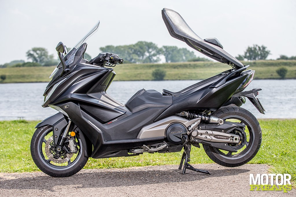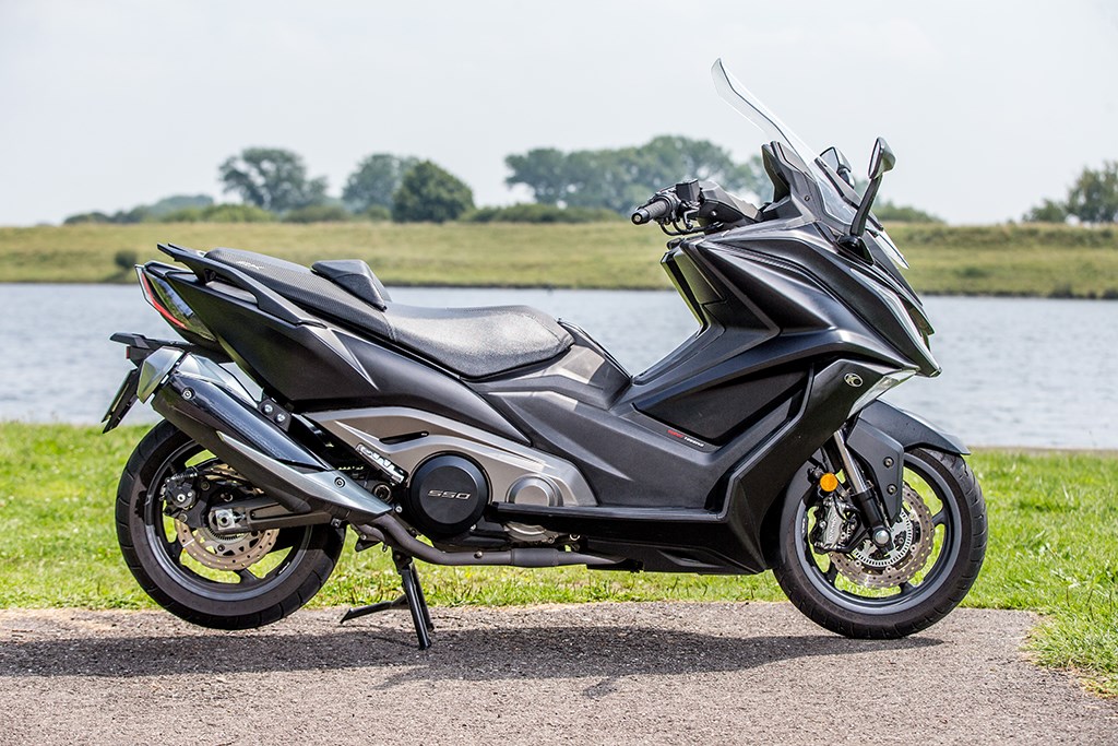 Alleen al wat design betreft is Kymco duidelijk voor een sportieve uitstraling gegaan, maar dan wel met een vleugje sierlijkheid. De scherpe lijnen doen denken aan een ZX-10R, terwijl de fraai gevormde ledverlichting (zeker het achterlicht) de AK550 een high-end uitstraling geeft. Ook wat uitrusting betreft is de AK550 meer dan compleet: handvatverwarming behoort net als bandenspanningscontrole tot de standaarduitrusting en in de console zijn twee niet-afsluitbare opbergvakjes voorzien (waarvan één met 12V-aansluiting), terwijl de ruimte onder het zadel plaats biedt aan twee integraalhelmen. Eigenlijk dus niets dan lof, totdat je hebt plaatsgenomen op het 785 mm hoge zadel met goed gepositioneerde lendesteun en je ogen vallen op de gedateerde knopjes met onlogische bediening, het wat onhandige sleutelloos contactslot en het ronduit lelijke
