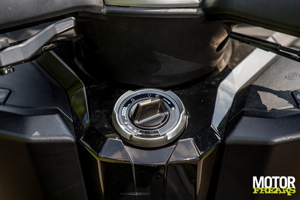 geeft je informatie over alles wat je maar zou willen weten (bvb. gemiddeld verbruik 4,1 l./100 km), de verklikkerlichtjes werden ondergebracht in een bijzonder fraai alu-opbouwtje in het midden van het fatbarstuur. Daaronder zit een kantelbaar knopje dat aan de ene kant het zadel opent, duw je het naar de andere kant, dan open je het klepje boven de tankdop. Onder het zadel kan je moeiteloos een integraal kwijt en er zit ook een 12V aansluiting voor gsm of gps in de verlichte bergruimte. Nog meer leuks voor de liefhebber van moderniteitjes: starten doe je voortaan zonder sleutel, het volstaat de smart key in je zak te hebben om alle functies te activeren.