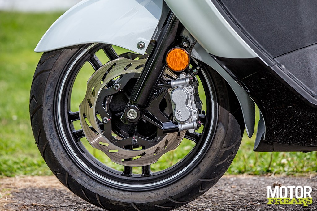 Het ijzersterke motorblok met lekker sportief geluid is echter niet het enige waarmee de AK550 overtuigt. Minstens zo goed is het rijwielgedeelte, waar door de Taiwanezen duidelijk flink over is nagedacht. Het tweecilinder motorblok is in een aluminium frame gemonteerd, de twee 15” wielen met Metzeler Feelfree rubber worden aan de voorkant via een 41 mm upside down voorvork en langs achteren middels een aluminium achterbrug met een horizontaal gemonteerde achtershock afgeveerd. Dat klinkt als een rijwielgedeelte van een normale motorfiets, waardoor de AK550 inderdaad als een échte motor stuurt en rijdt. Sterker, eenmaal mijn thuiscircuit… excuus, dijkweggetje opgestuurd hebben vier sportieve naked-rijders (waaronder twee supermotards) geen schijn van kans. Na overduidelijk mij te hebben opgewacht werd door het viertal de jacht weer ingezet, ongetwijfeld met als doel mij (het liefst op het achterwiel) weer voorbij te gaan, maar in plaats daarvan werden ze op een koude douche getrakteerd. Het is dat je geen tank tussen je benen hebt en de voeten iets naar voren op de vloerplaat staan