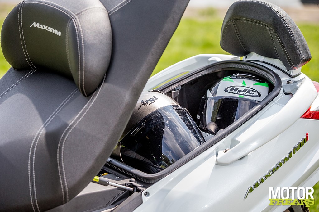 Bovendien, wel eens van het verhaal van de haas en de schildpad gehoord?Ze bedienen de drie remschijven op de SYM waarvan de twee op het 15” grote voorwiel zijn voorzien van radiaal opgehangen remklauwen. Het resultaat mag er zijn, want waar hij qua motorische prestaties nog zijn tegenstrevers voor zich moet laten, doet hij tijdens de meerdere remtesten elke keer weer met de besten mee! Niet geheel onbelangrijk op een maxiscooter is zijn praktische inzetbaarheid. En juist op dit onderdeel doet hij zeker niet onder voor de rest. Onder het zadel namelijk ruimte voor een integraalhelm en een jethelm en dan zijn er nog meer opbergruimtes op de scooter aanwezig. Onder het stuur treffen we namelijk nog twee kleine vakjes aan, met hier centraal onder een groter en afsluitbaar compartiment met zowel een 12V- als USB aansluiting.