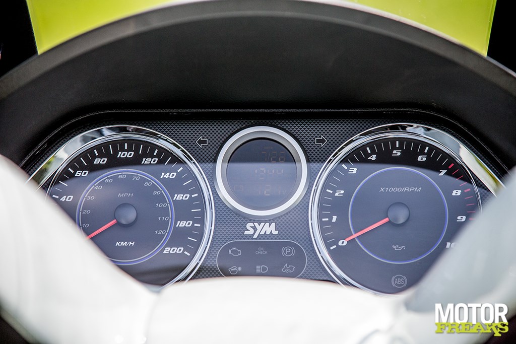 De importeur heeft de in twee standen instelbare ruit op de hoogste stand gezet en dat zorgt er voor dat de wind met mijn 1m75 geheel over de helm wordt gedirigeerd. We tikken op de snelweg zelfs nog een topsnelheid aan van net over de 160km/u… Helemaal niet verkeerd, al wordt op onze gps duidelijk dat de snelheidsmeter behoorlijk overdrijft. We worden voor het overige wel blij van het overzichtelijke no-nonsense design van het instrumentarium. In een tijd dat fabrikanten overstappen naar geheel dan wel gedeeltelijk digitale tellers is deze Maxsym nog een uitzondering. Klassieke grote analoge klokken (snelheidsmeter en toerenteller) en een klein digitaal display voor zaken zoals tijd, kilometerstand, dagteller en temperatuur. Doordat je niet zo heel veel keuzemogelijkheden hebt is een extra bedieningsknop op één van de stuurhelften niet nodig en hebben ze bij SYM twee grotere bedieningsknoppen onderin het dashboard geplaatst om tussen de informatie te switchen. Op het stuur vinden we ook nog twee forse en meervoudig instelbare remhendels.