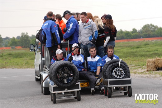 voor het begin van de races. Vanwege de vele en forse regenbuien was het terrein waarop het paddock was bedacht ondergelopen. Het terrein was onbegaanbaar, waardoor teams moesten uitwijken naar verschillende plekken om hun trailers, tenten en campers op te slaan. Deze terreinen waren wel droog, maar daar stond het gras wel meer dan twee kontjes hoog. Hovenier en Supersport 600 coureur Michel van Kleef had daar als een van de weinigen een goede oplossing voor. Van Kleef had namelijk een grasmaaier in zijn trailer staan, zorgde voor een vlak, gemaaid plekje op het paddock en zette vervolgens zijn tentenkamp op. Een echte Nederlandse coureur is op alles voorbereid, zo blijkt!