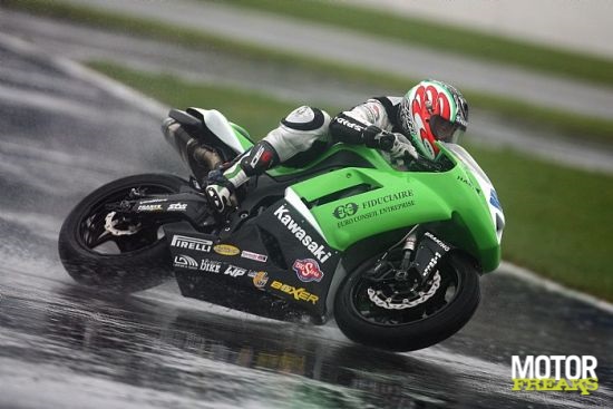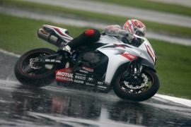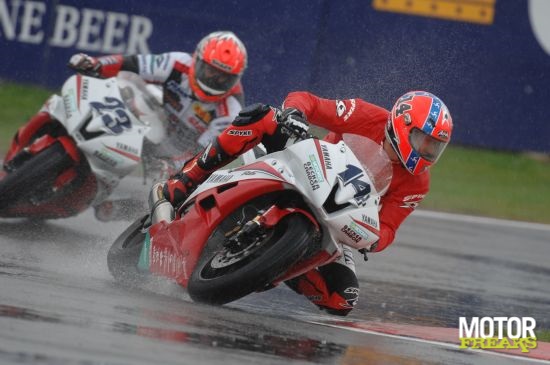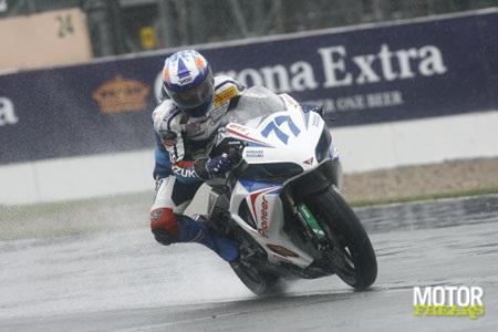 Gistermiddag werd - net als bij de Superbikes - op een zeiknat circuit van Silverstone de zevende race verreden in het World Supersport kampioenschap. In een bizarre race, waar slechts negentien van de tweeëndertig gestartte rijders de finish wisten te halen, werd Barry Veneman uiteindelijk tiende maar wist teamgenoot Vesa Kallio helaas de race, door een crash, niet te finishen. Enkele toppers, maar uiteraard ook mindere coureurs, vonden hun waterloo, maar één man kwam er duidelijk boven erm... drijven! In de warm-up (die dus al onder natte omstandigheden werd verreden) waren al twee rode vlag situatie geweest, één daarvan veroorzaakt door Barry Veneman die met een highsider behoorlijk hard ten val was gekomen. Even leek het een zware crash met nare gevolgen te zijn, maar dat bleek achteraf gelukkig mee te vallen. Veneman kwam terug in de pitbox en pakte meteen zijn tweede motor om de warm-up te hervatten. Enige tijd later kwam Gianluca Nannelli eveneens hard ten val en was er wederom sprake van een rode vlag situatie. Snelste man in de warm-up was Davide Giugliano (Lightspeed-Kawasaki), vóór Kenan Sofuoglu (HANNspree TenKate-Honda) en Anthony West (WorldSSP-Yamaha), die de nog steeds geblesseerde Kevin Curtain verving. Bij de start was Kenan Sofuoglu direct goed weg en dook als eerste... de baan af! Het was even vreemd om géén HANNspreeTenKate-Honda vooraan te zien maar al snel was duidelijk dat hij niet meer in de baan was.