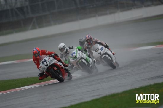 Intussen werd er wel "gewoon" geraced (hoewel het meer weg had van een jet-ski wedstrijd!) en had Massimo Roccoli de leiding vóór Broc Parkes, Katsuaki Fujiwara, Fabien Foret, Yves Polzer, Davide Giugliano en de (vanaf een zestiende startplek!) oprukkende Anthony West. Barry Veneman had een redelijke start en kwam de eerste ronde op een tiende positie door, teamgenoot Vesa Kallio wist maar liefst zeven plaatsen goed te maken in de eerste ronde en reed meteen op de veertiende positie. Na Sofuoglu was Yoann Tiberio het volgende slachtoffer van de nukken van pluvius. De jonge Fransoos kent dit seizoen geen geluk en ging op een vijfde plaats rijdend onderuit. Terwijl Broc Parkes kans zag een gat van drie seconde te slaan slalomde zijn tijdelijke teamgenoot Anthony West langs zijn tegenstanders naar voren en vond in de zesde ronde aansluiting bij Parkes.