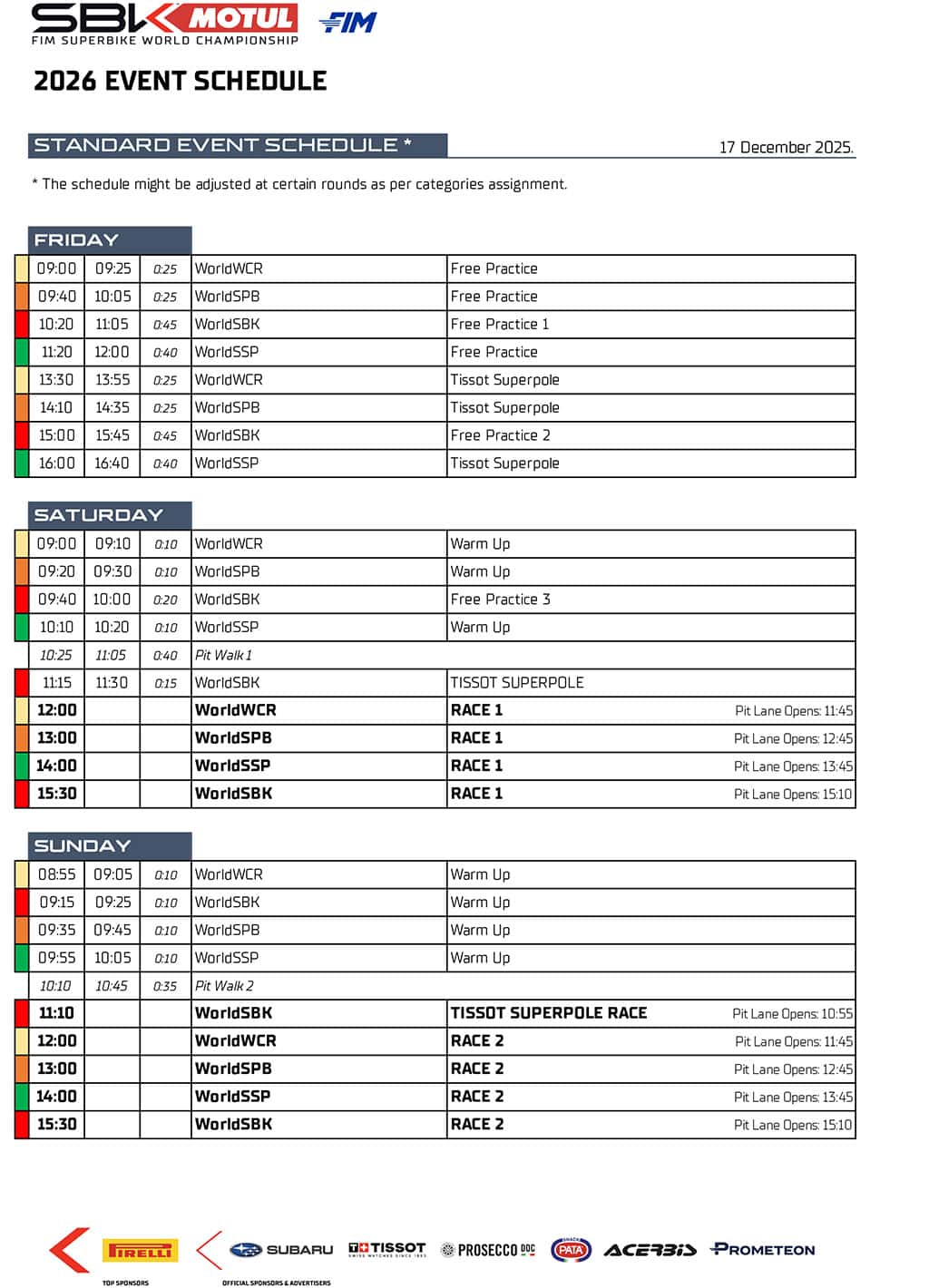 Concreet betekent dit dat de koningsklasse van het WorldSBK-kampioenschap pas na de races van WorldWCR, WorldSPB en WorldSSP de baan op gaat. Daarmee krijgt het hoofdnummer van het weekend letterlijk en figuurlijk de laatste spot op beide racedagen.