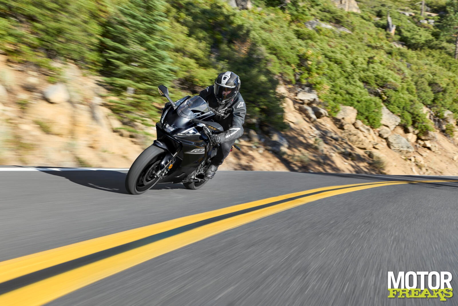 De 41 mm upside-down voorvork krijgt nu aluminium binnenpoten, goed voor 350 gram gewichtsbesparing en een lichter stuurgevoel. De vork is volledig instelbaar. Nieuw zijn ook de SpinForged-wielen, die niet alleen lichter zijn maar vooral minder massatraagheid hebben – een merkbaar voordeel bij snel omgooien in bochten. De wielen zijn standaard voorzien van Bridgestone S23-banden, die meer grip moeten leveren.
