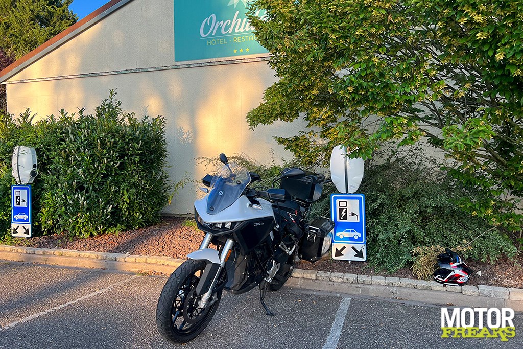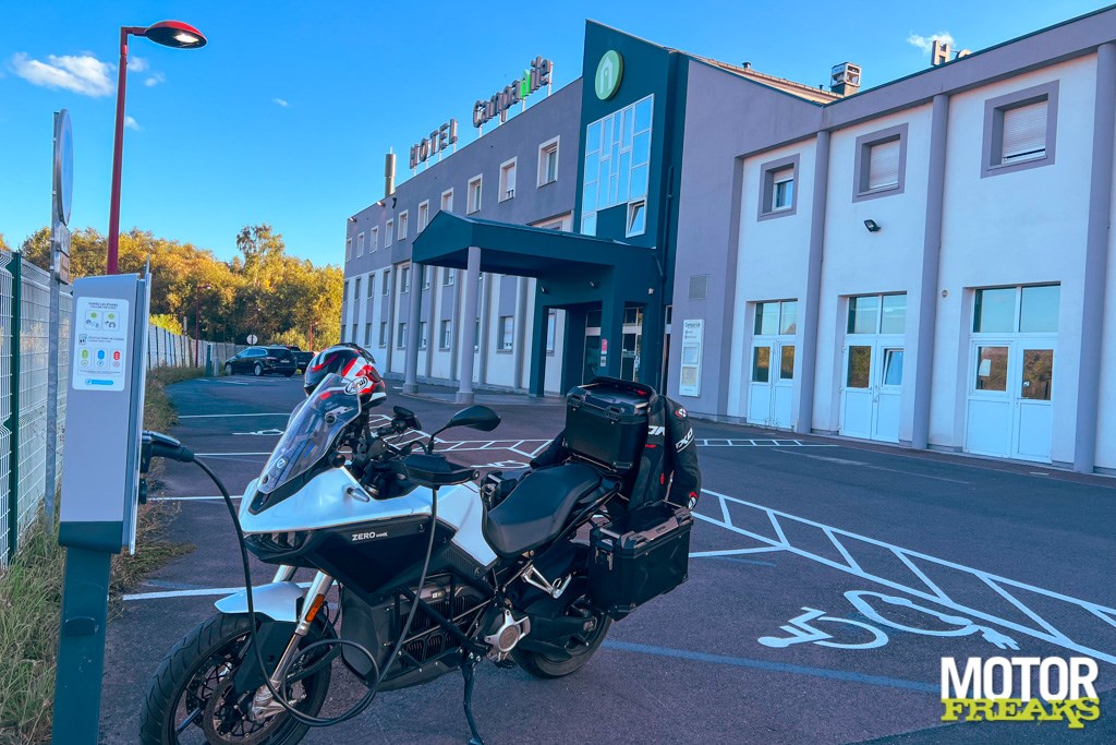 Ondanks de afwezigheid van straatverlichting en bermpaaltjes valt het rijden in het pikkedonker me alleszins mee, maar het begint wel af te koelen waardoor gaandeweg ondanks Pinlock m’n vizier begint te beslaan. Dan maar met open vizier rijden en door met een hand op de tank zo dicht mogelijk achter het scherm te kruipen is dat prima te doen. Twee uur en een kwartier duurt de 146 kilometer trip door de duisternis tot de Carrefour in Bourg-en-Bresse, waar ik de Zero weer aan de lader zet en op zoek ga naar een hotel. Het is inmiddels half elf en de enige optie die ik op dit late tijdstip nog heb is een IBIS hotel aan de tolweg A40,