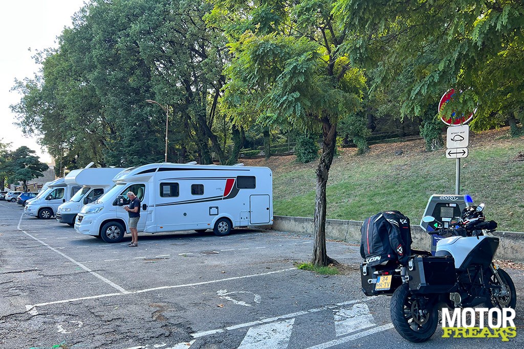 Ondanks dat Sisteron in principe te zoen moet zijn besluit ik om bij de eerste de beste paal die in de TomTom verschijnt even te stekkeren, maar het is alsof de duvel ermee speelt: ze zijn ofwel onvindbaar, ofwel accepteren ze m’n pasjes niet, tot ik met nog 22 kilometer te gaan in een klein dorpje een camperparkeerplaats met laadpaal spot van het type waarvan ik inmiddels weet dat ‘ie mijn pasje accepteert. Na 203 kilometer zet ik de Zero met nog 10% restlading